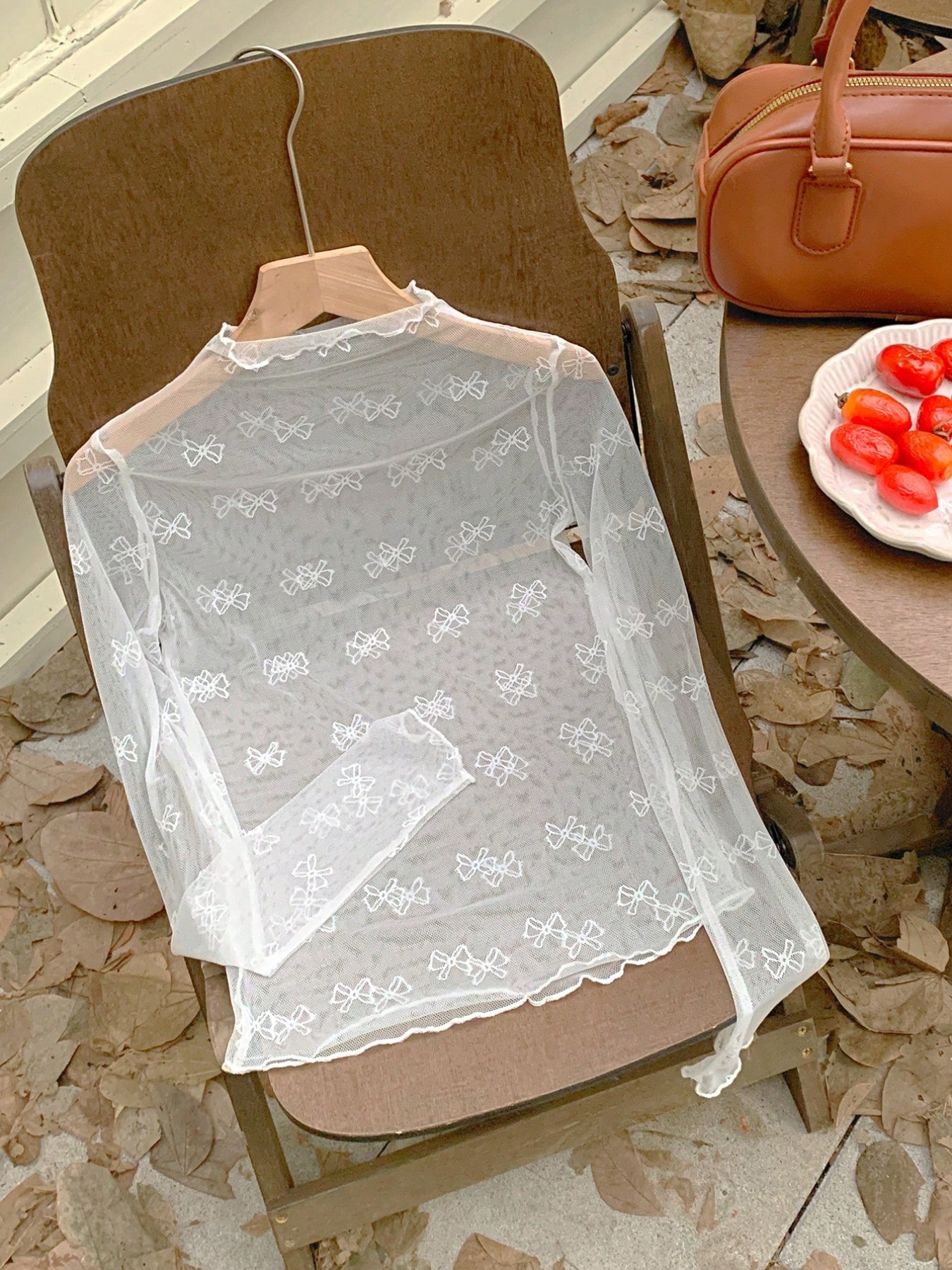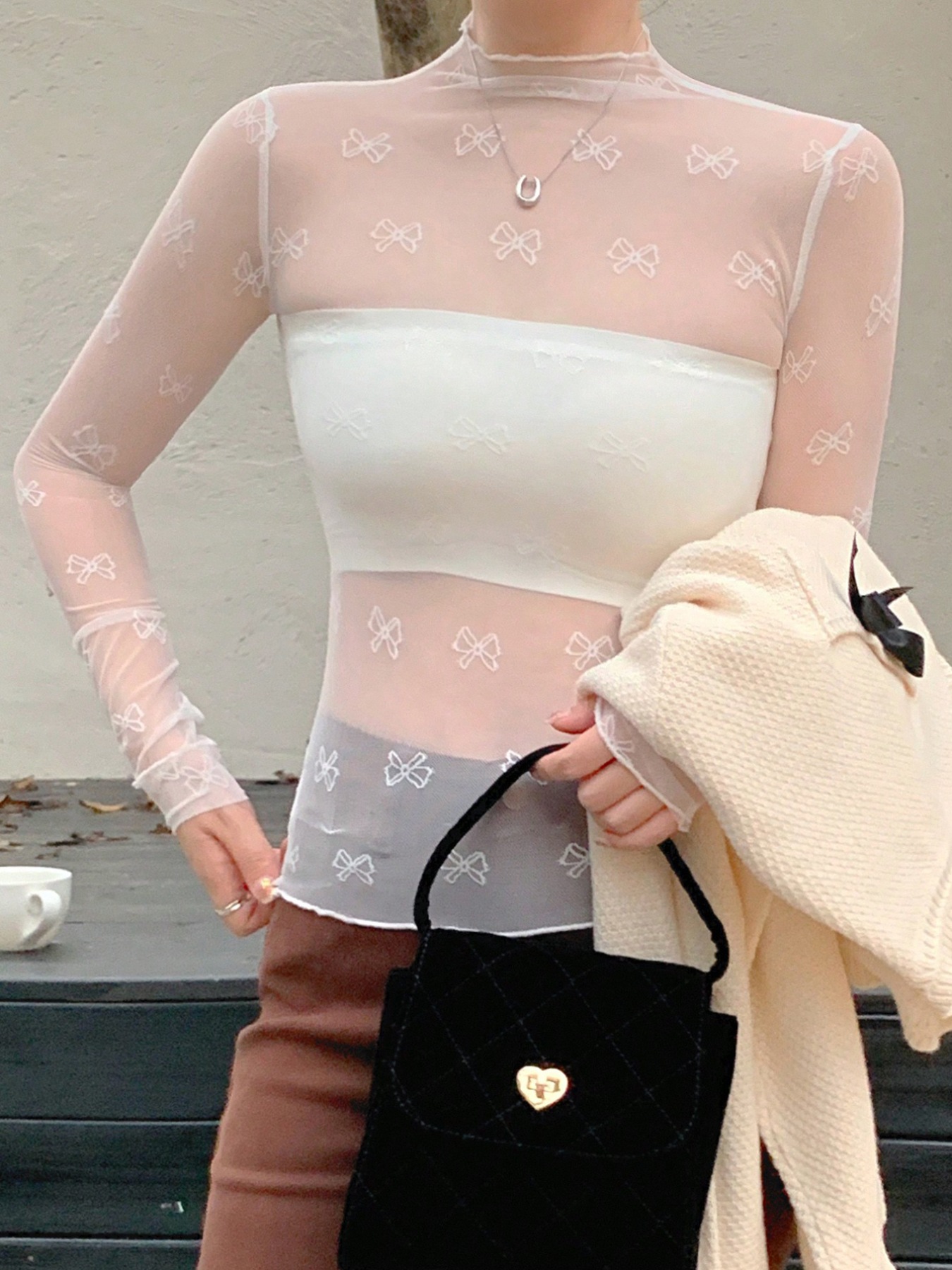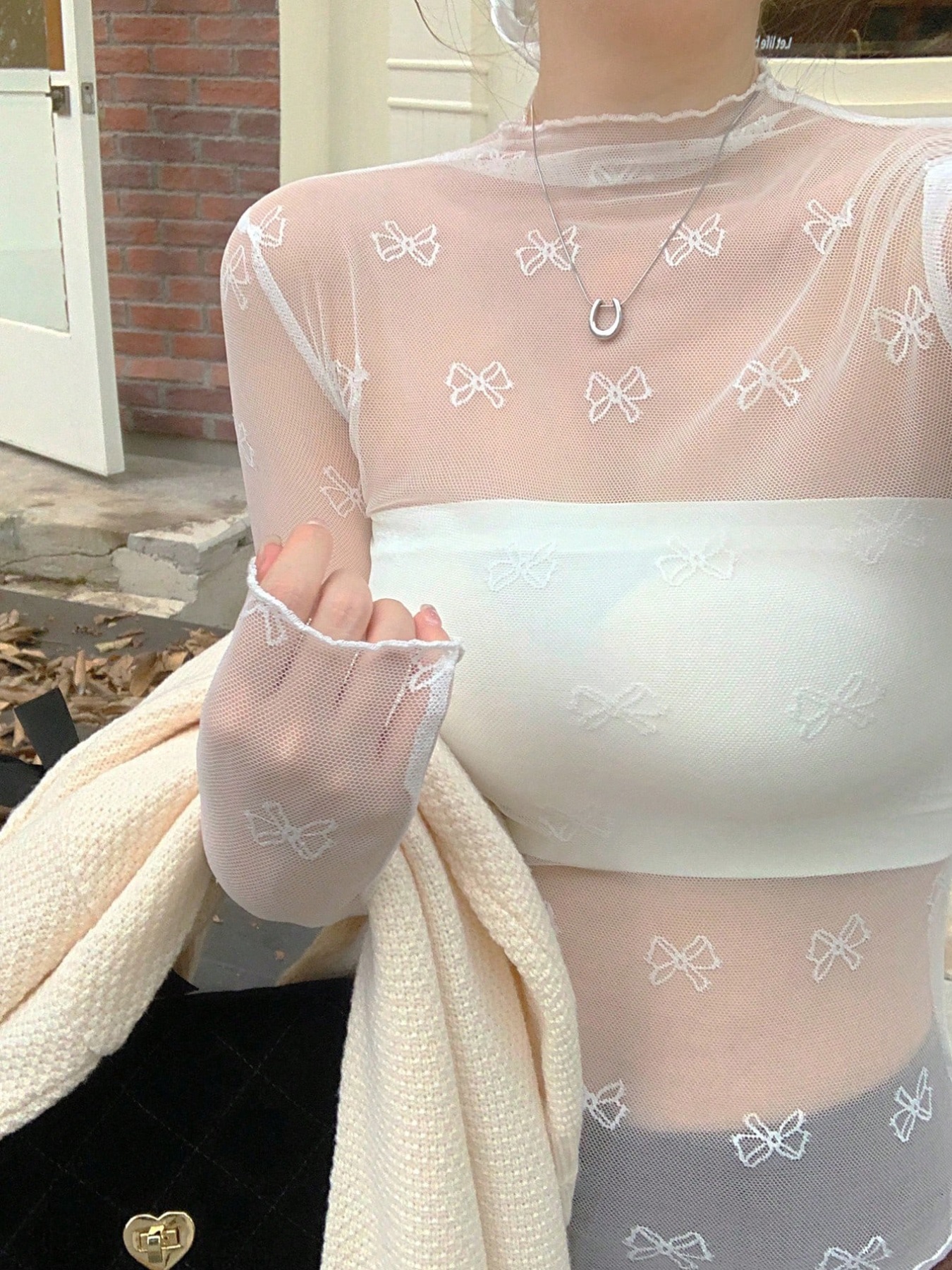 Bow Print Sheer Mesh Top