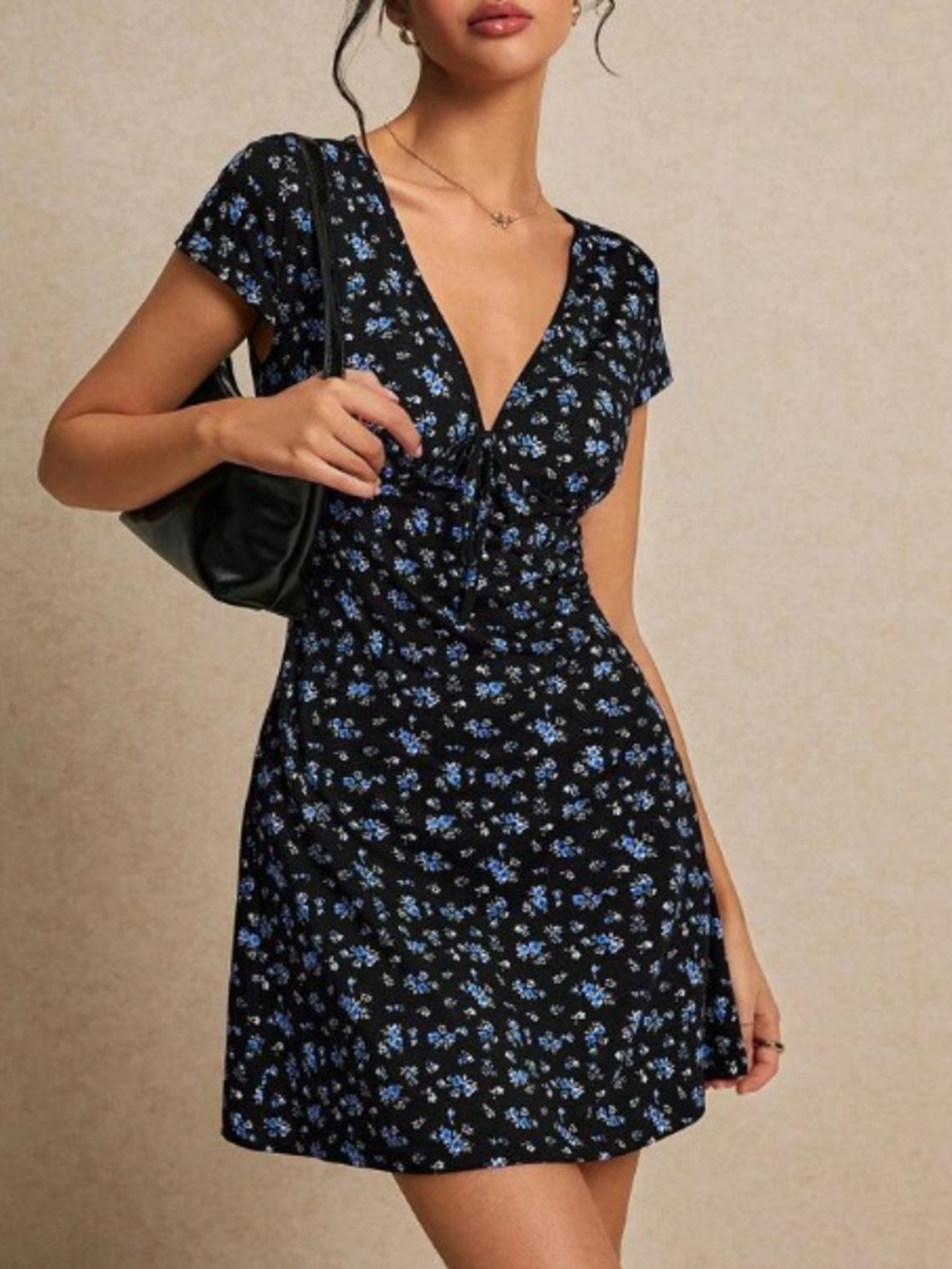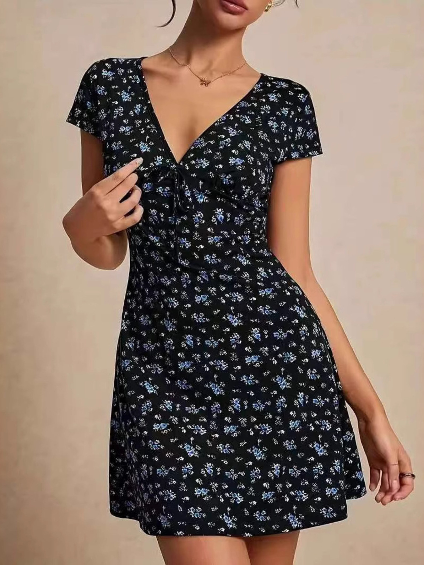 Floral V-Neck Short Sleeve Mini Dress