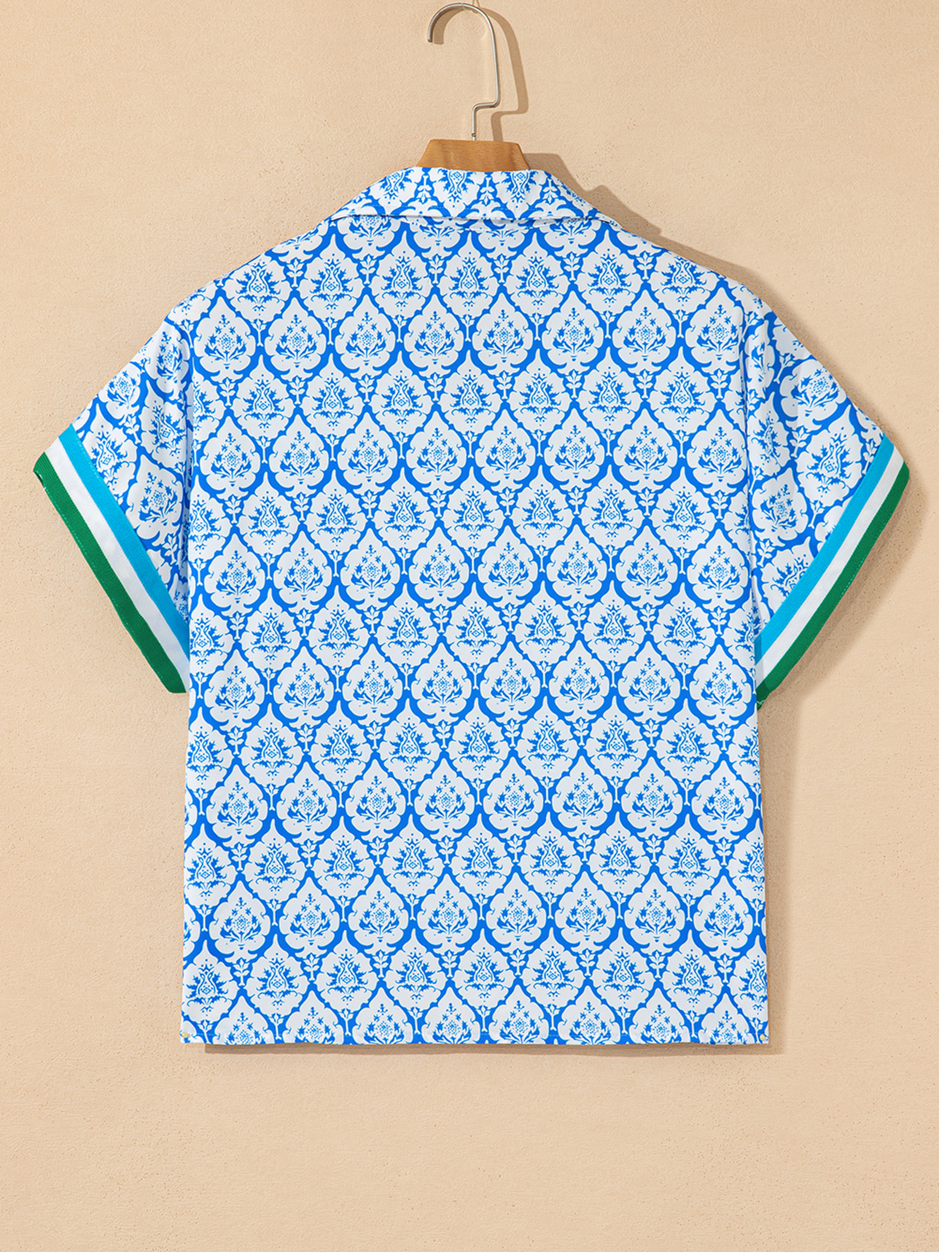 Western Print Zipped Collar Short Sleeve Summer Blouse Top