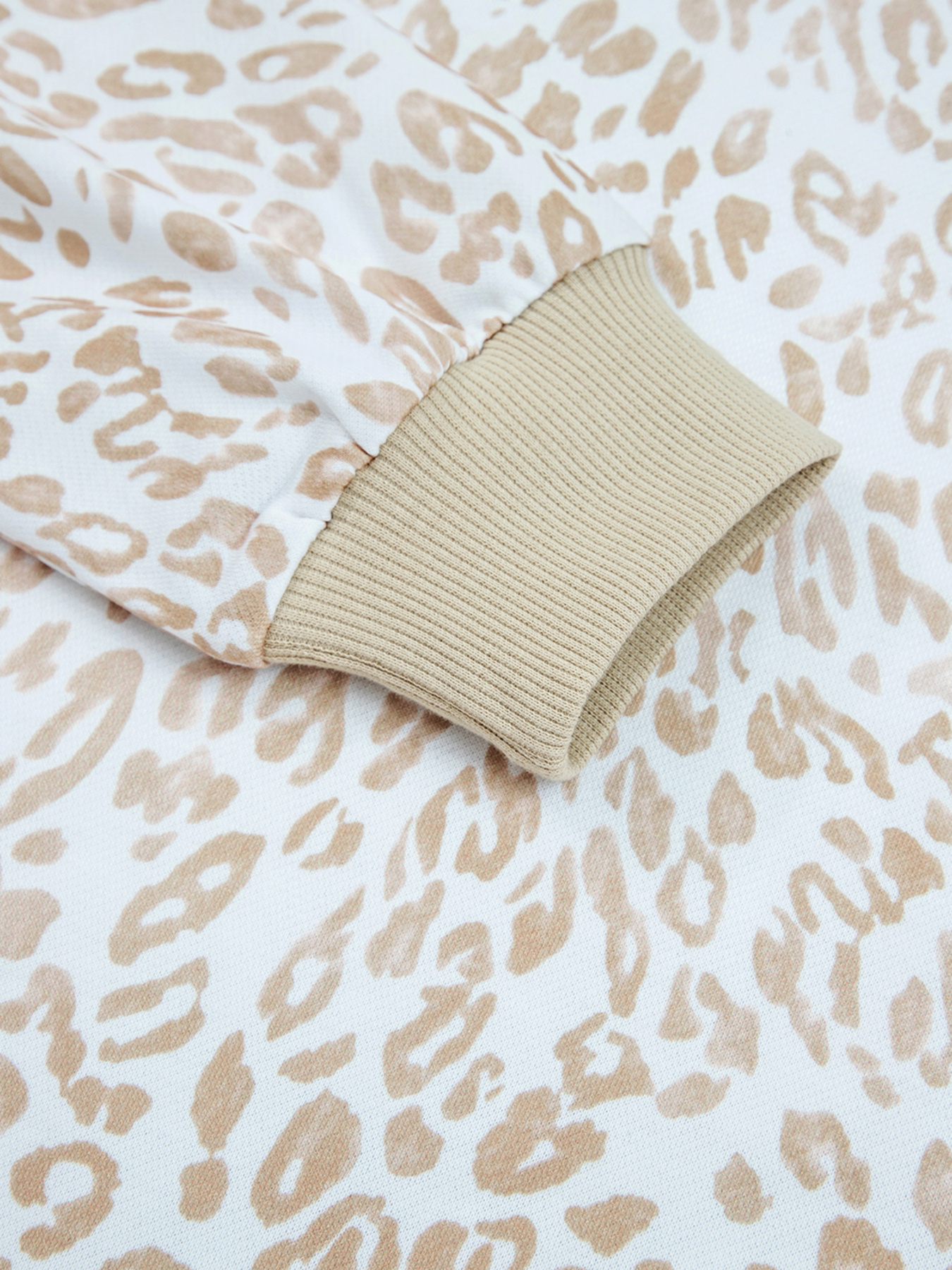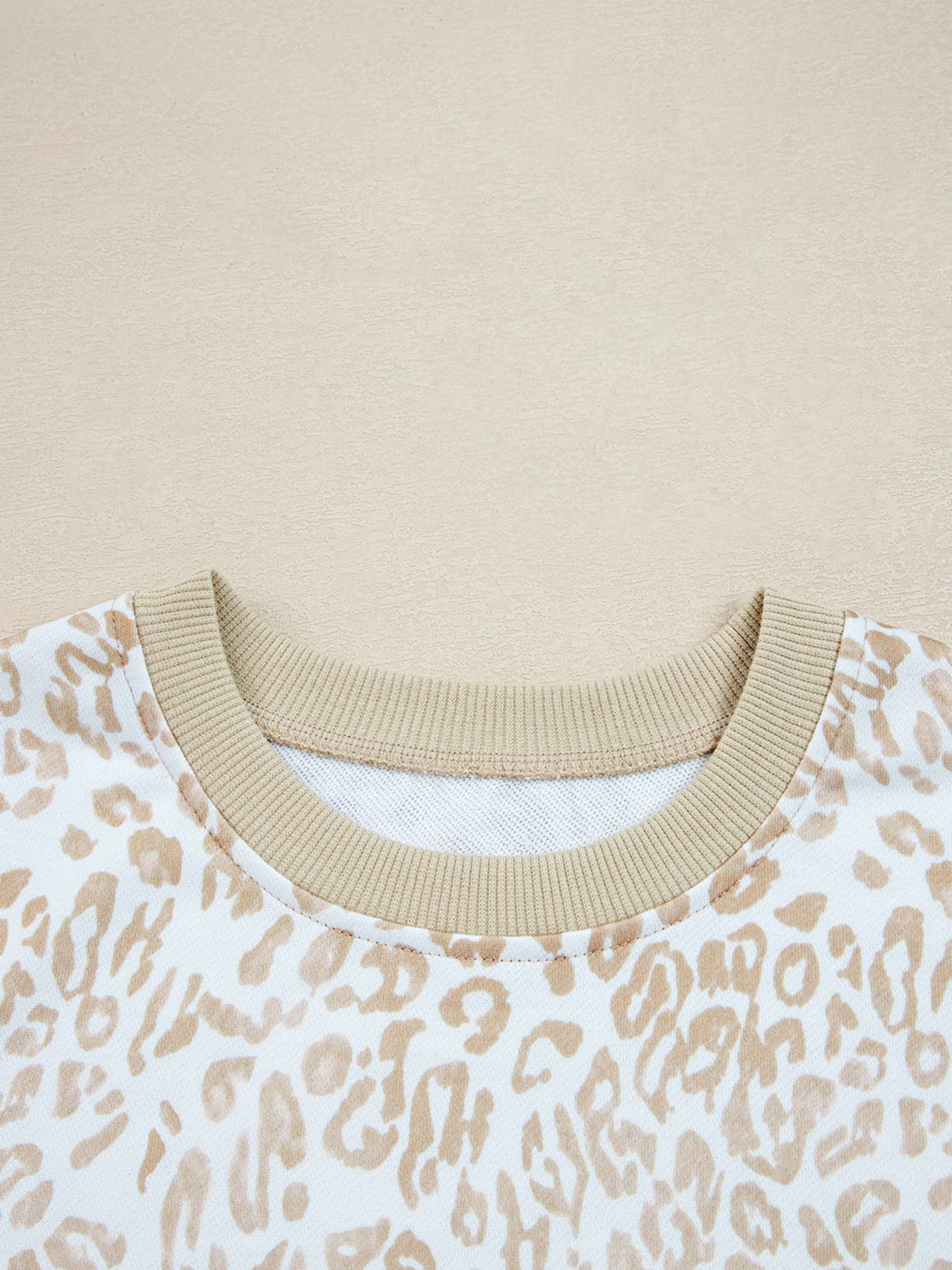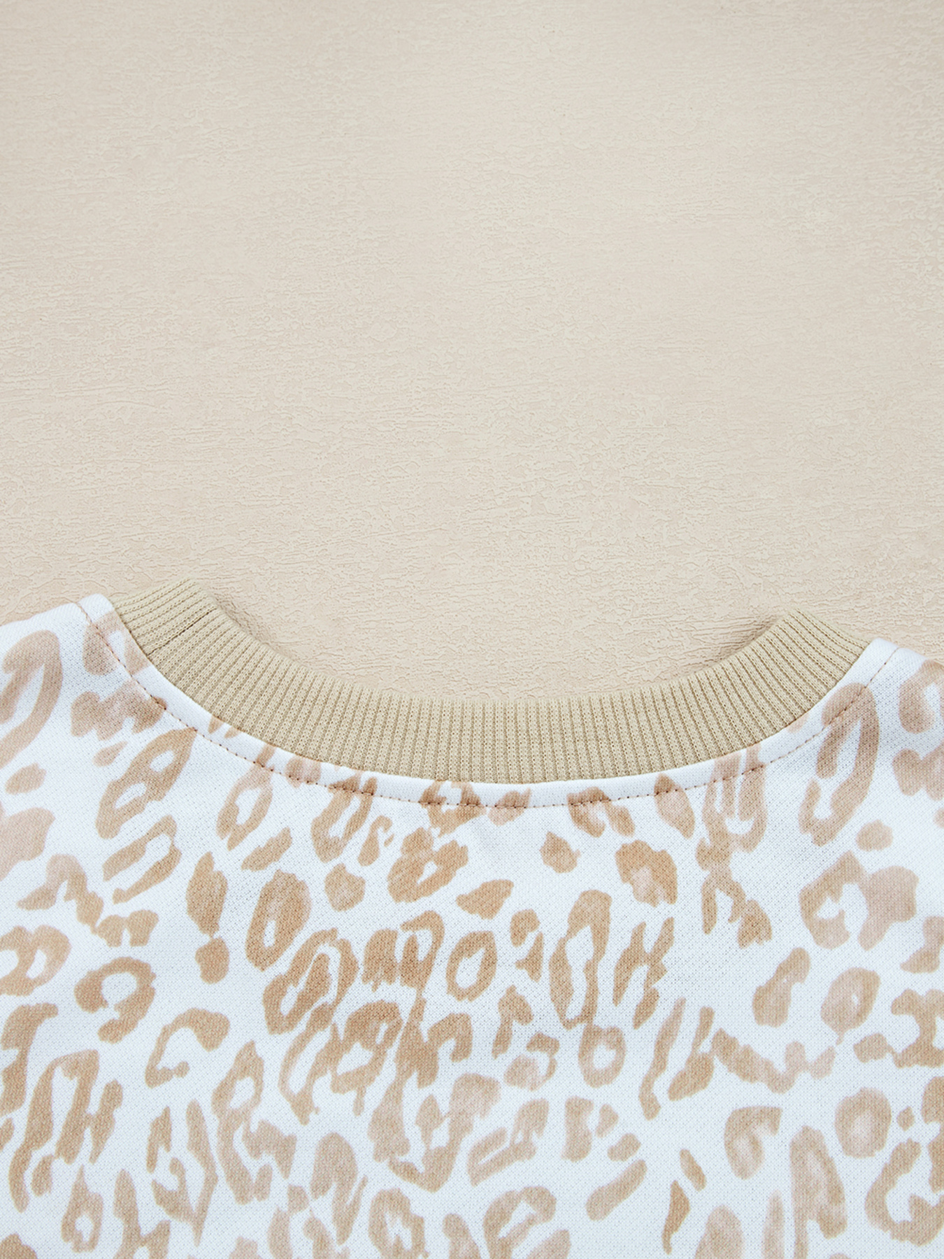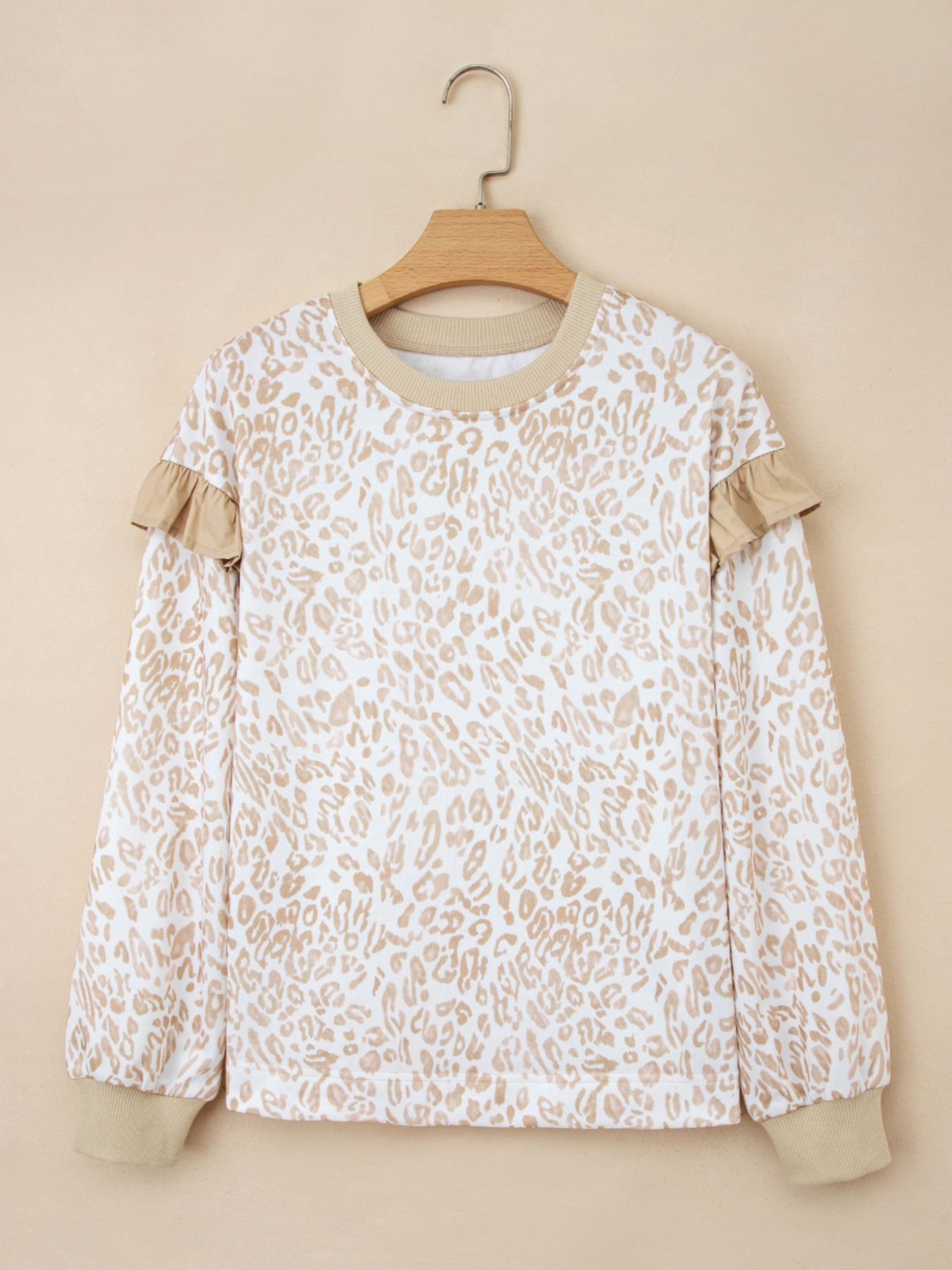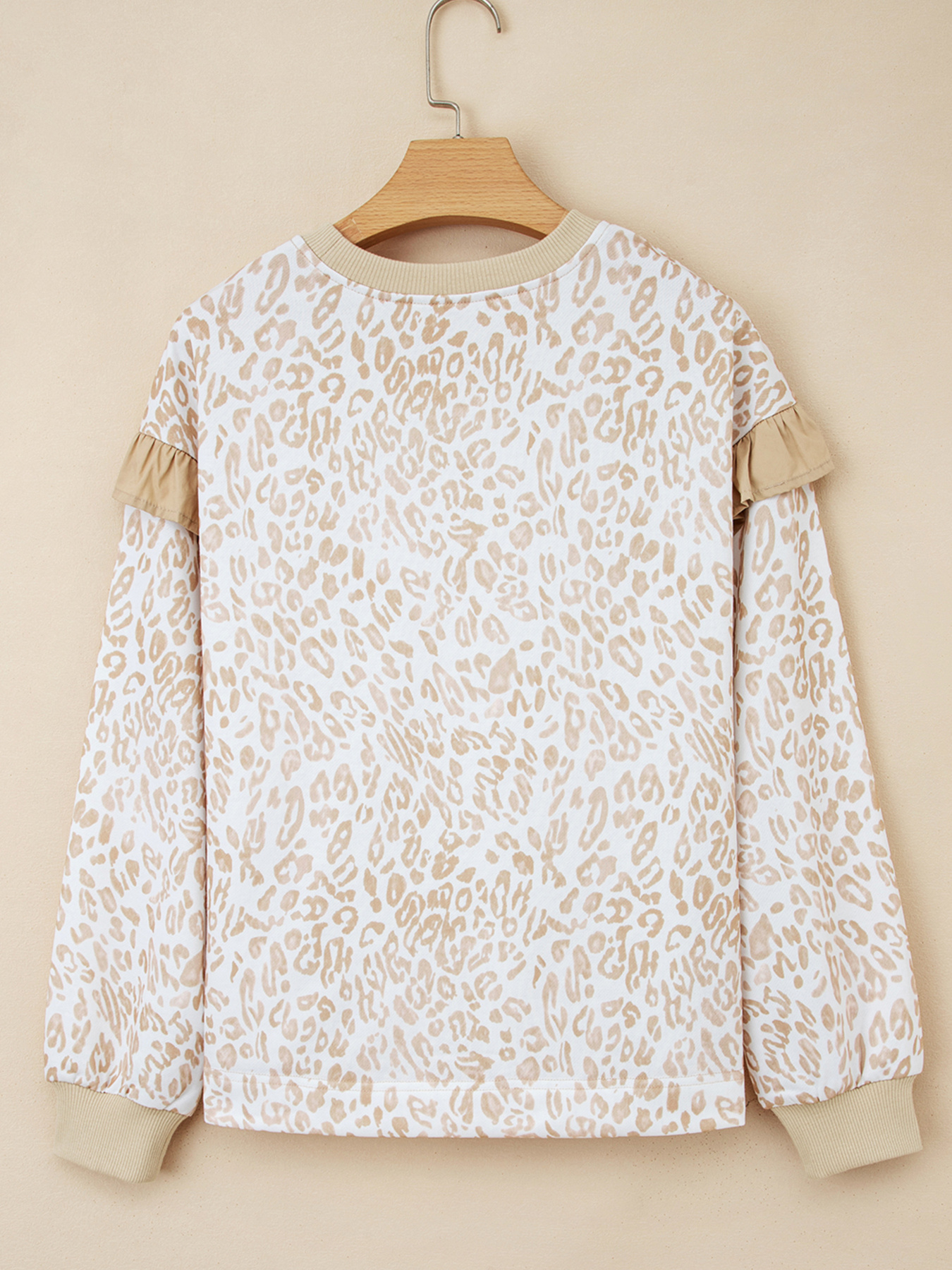 Leopard Ruffle Detail Ribbed Trim Round Neck Sweatshirt