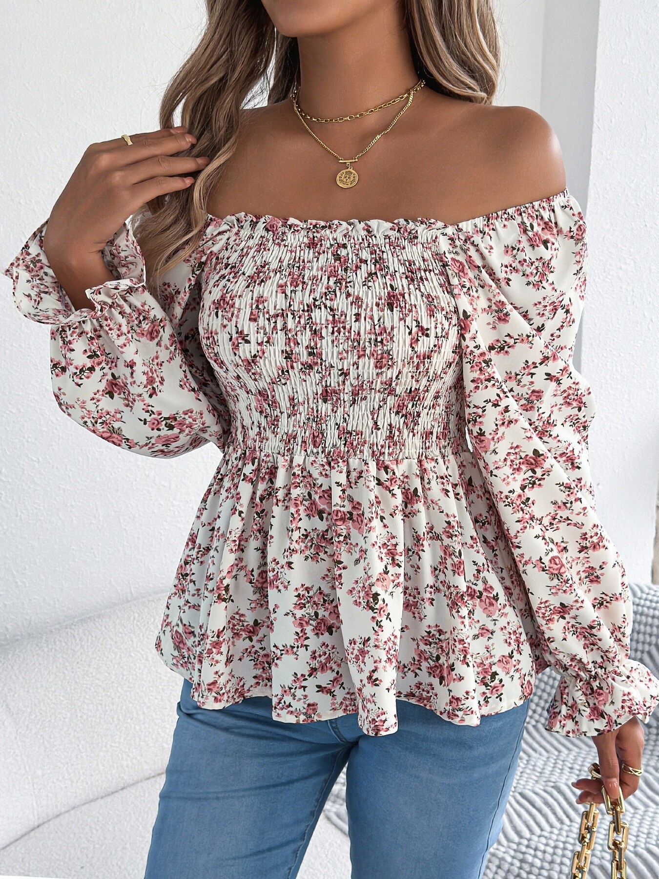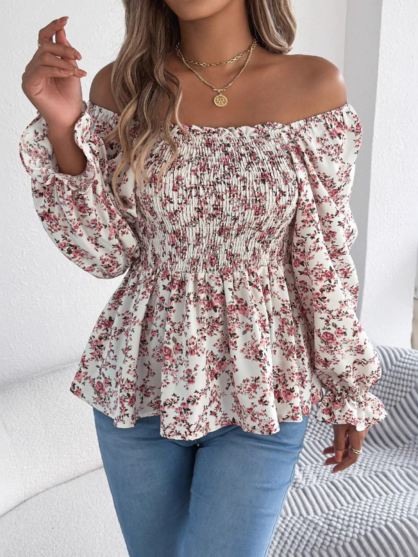 Full Size Floral Print Smocked Long Sleeve Blouse Plus Size