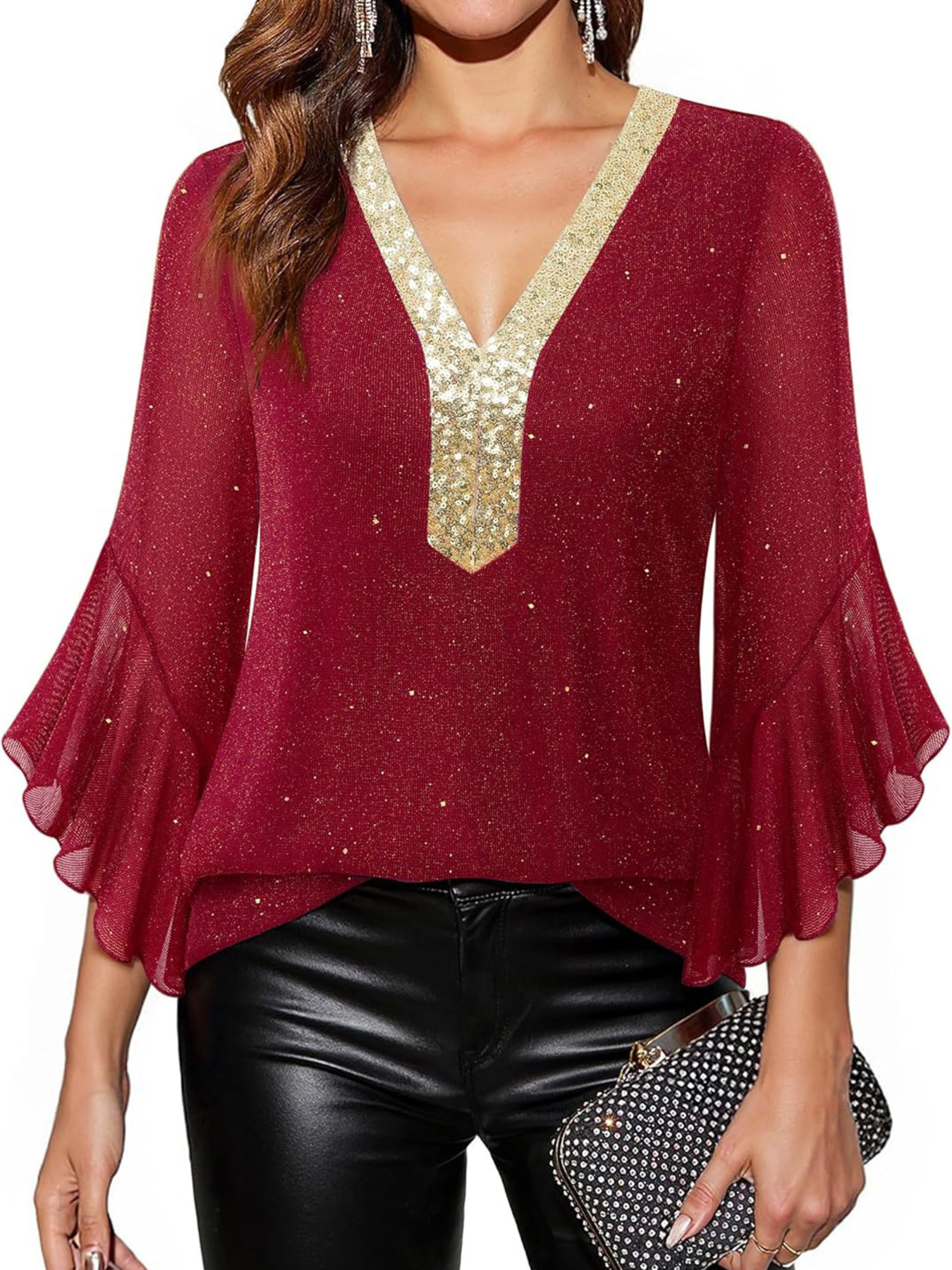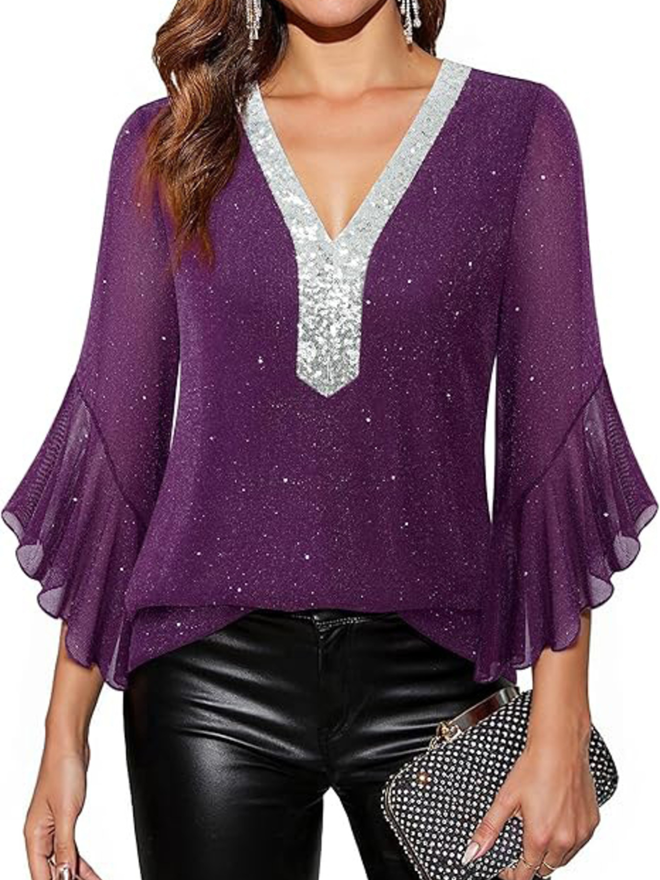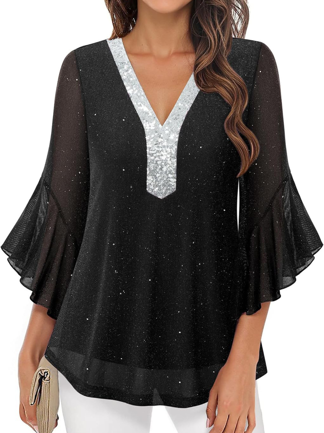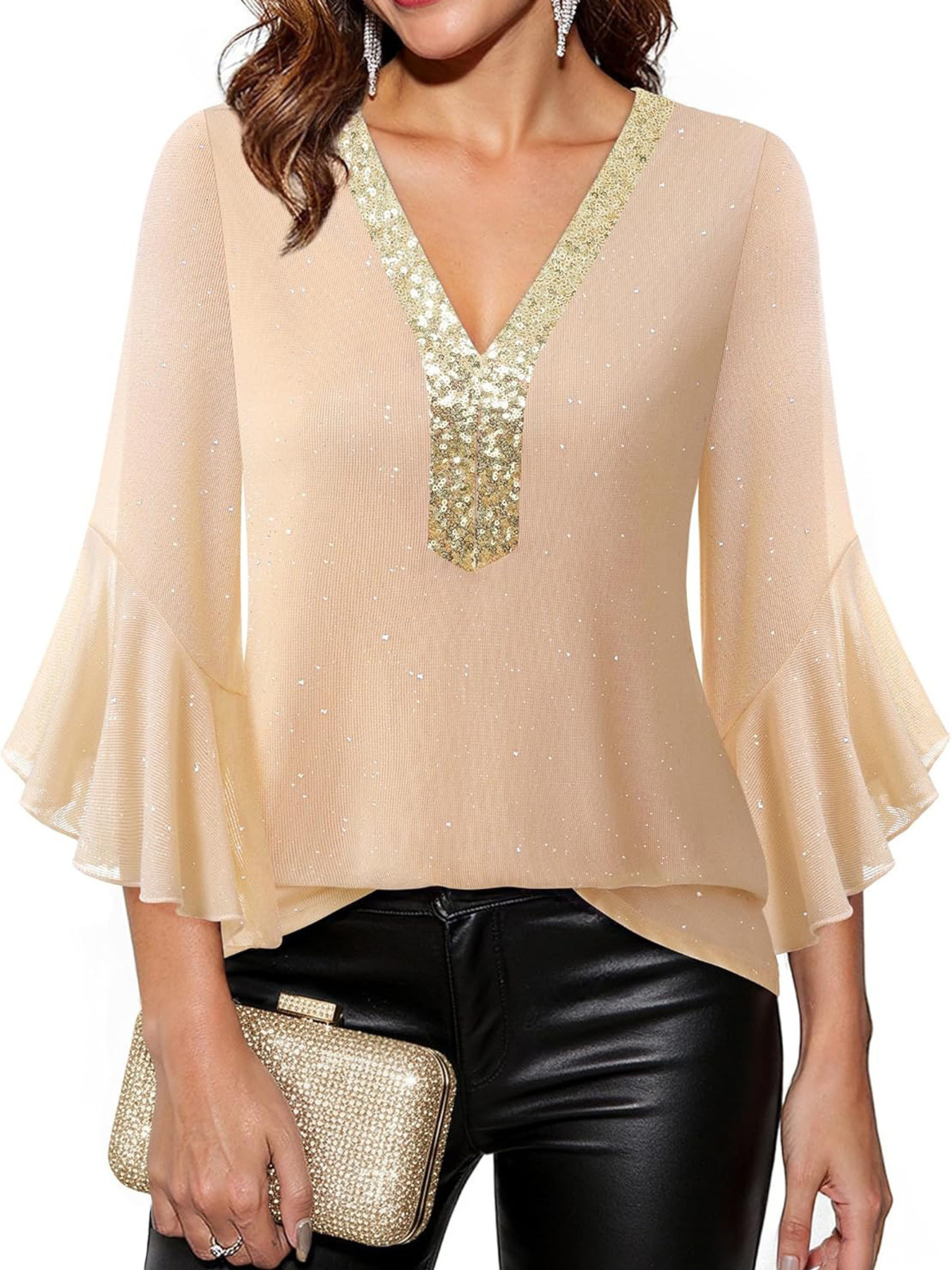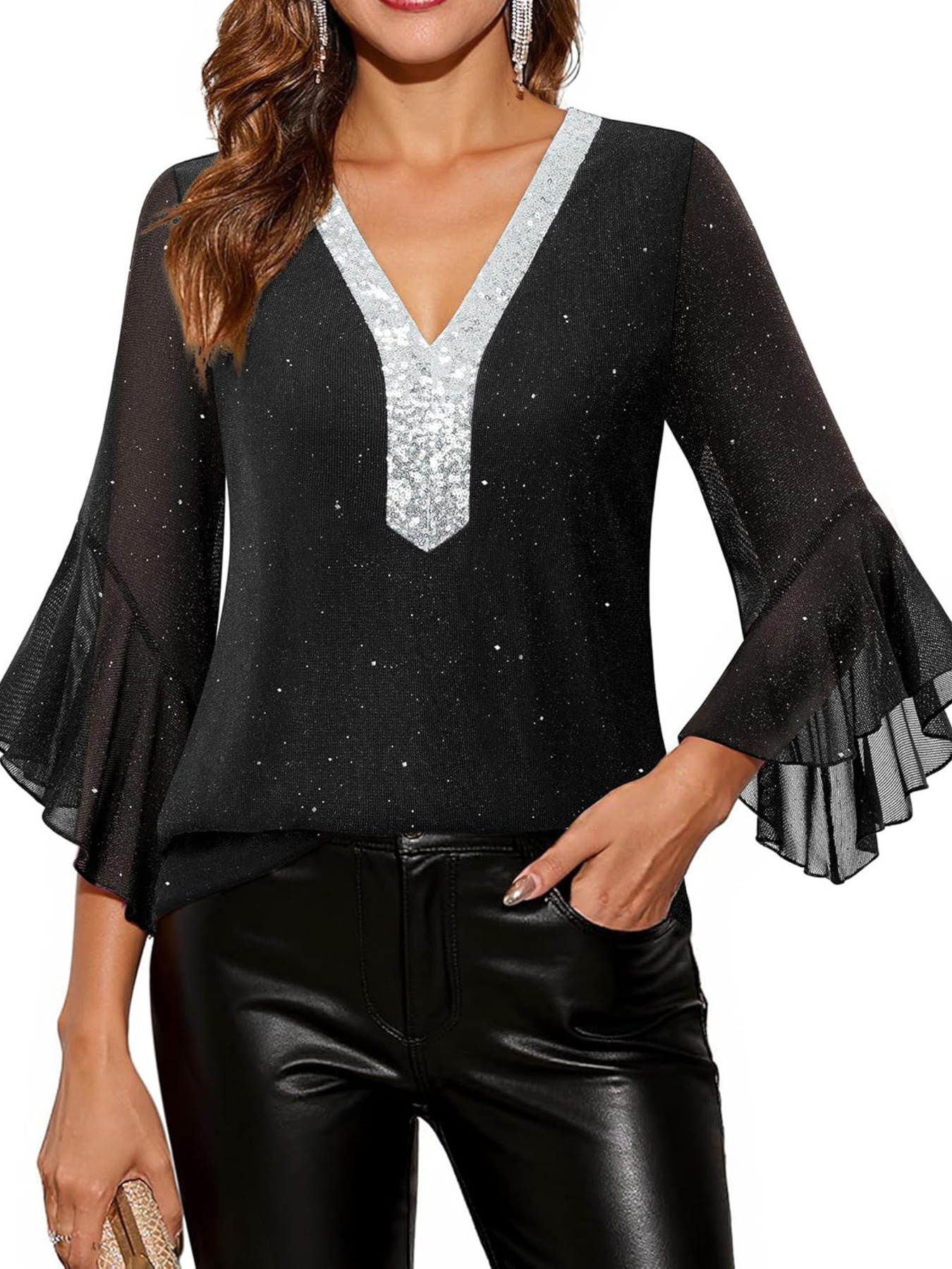 Sequin V-Neck Flounce Sleeve Blouse