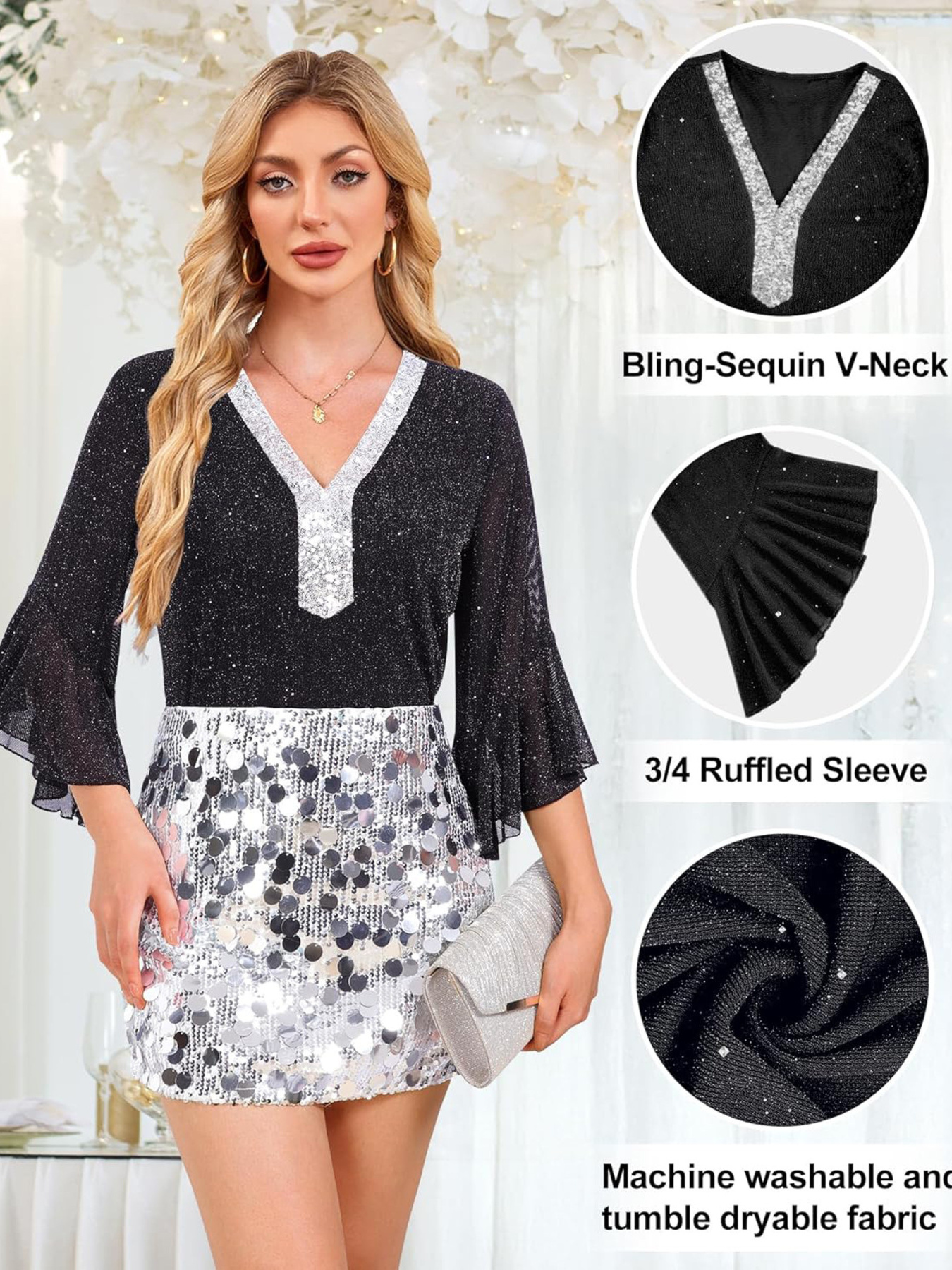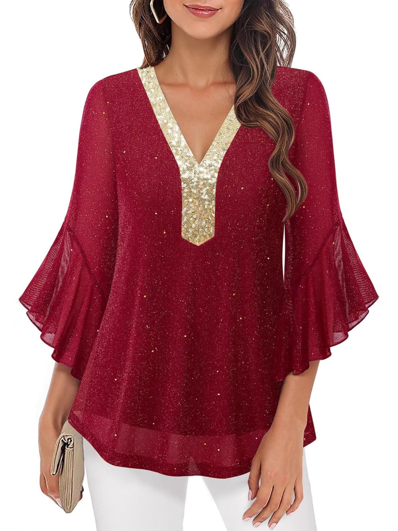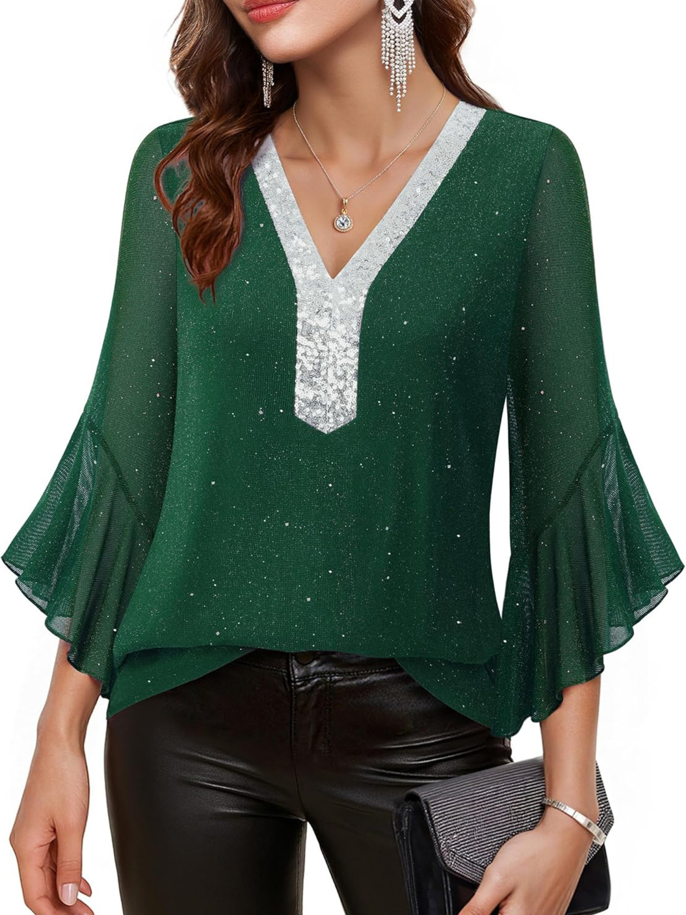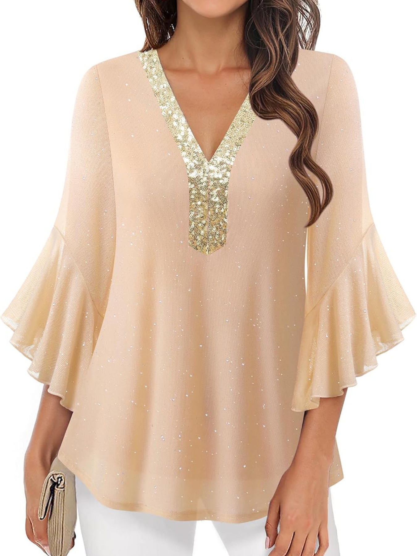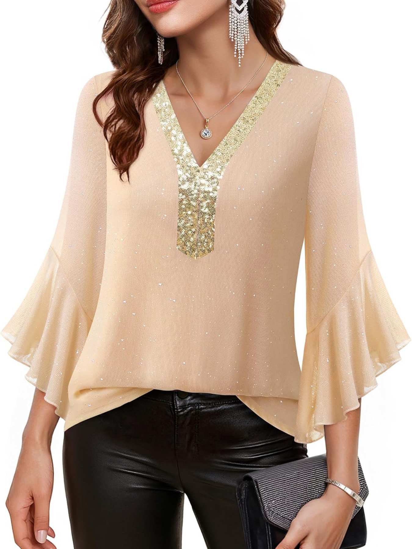Sequin V-Neck Flounce Sleeve Blouse