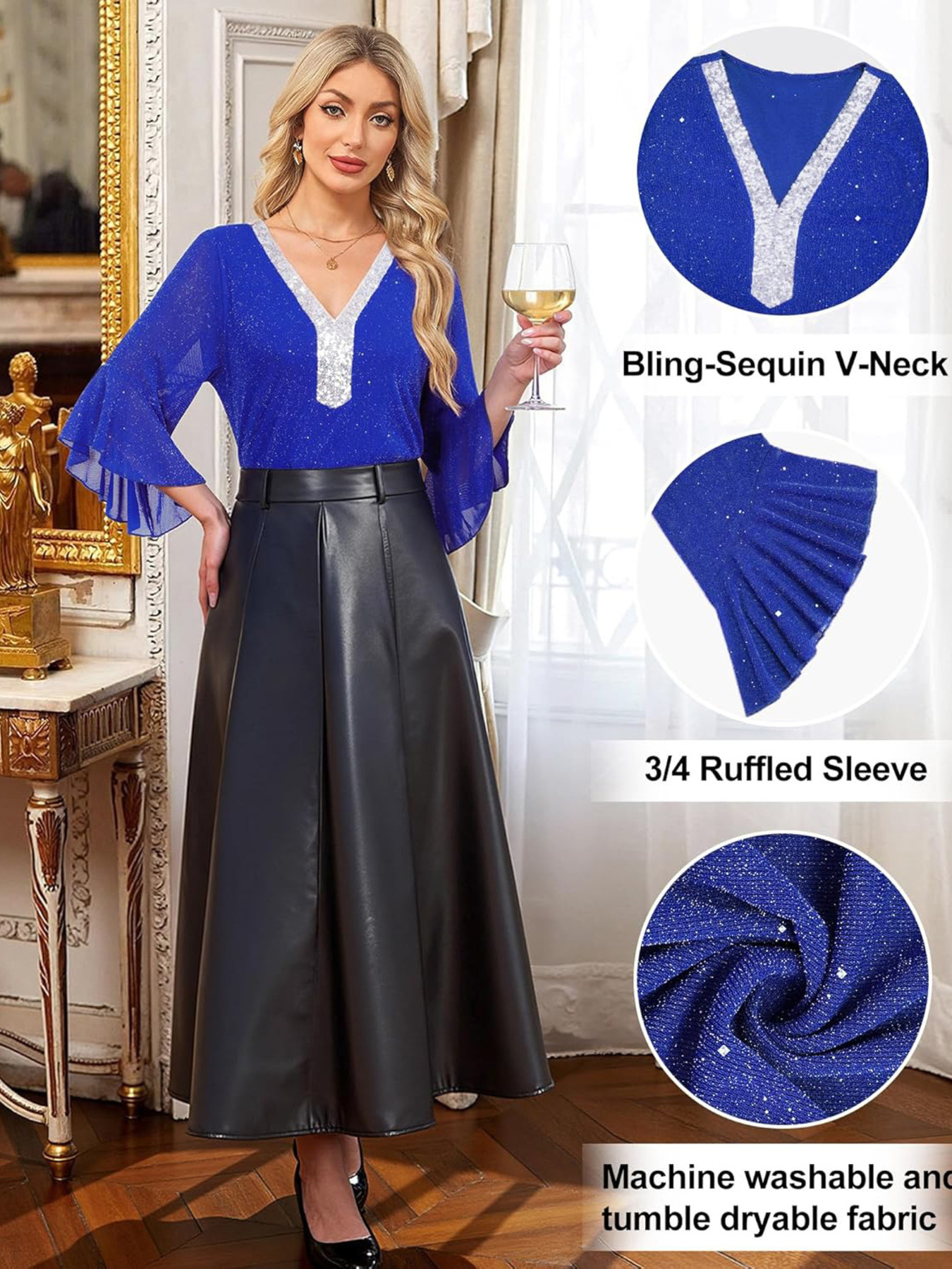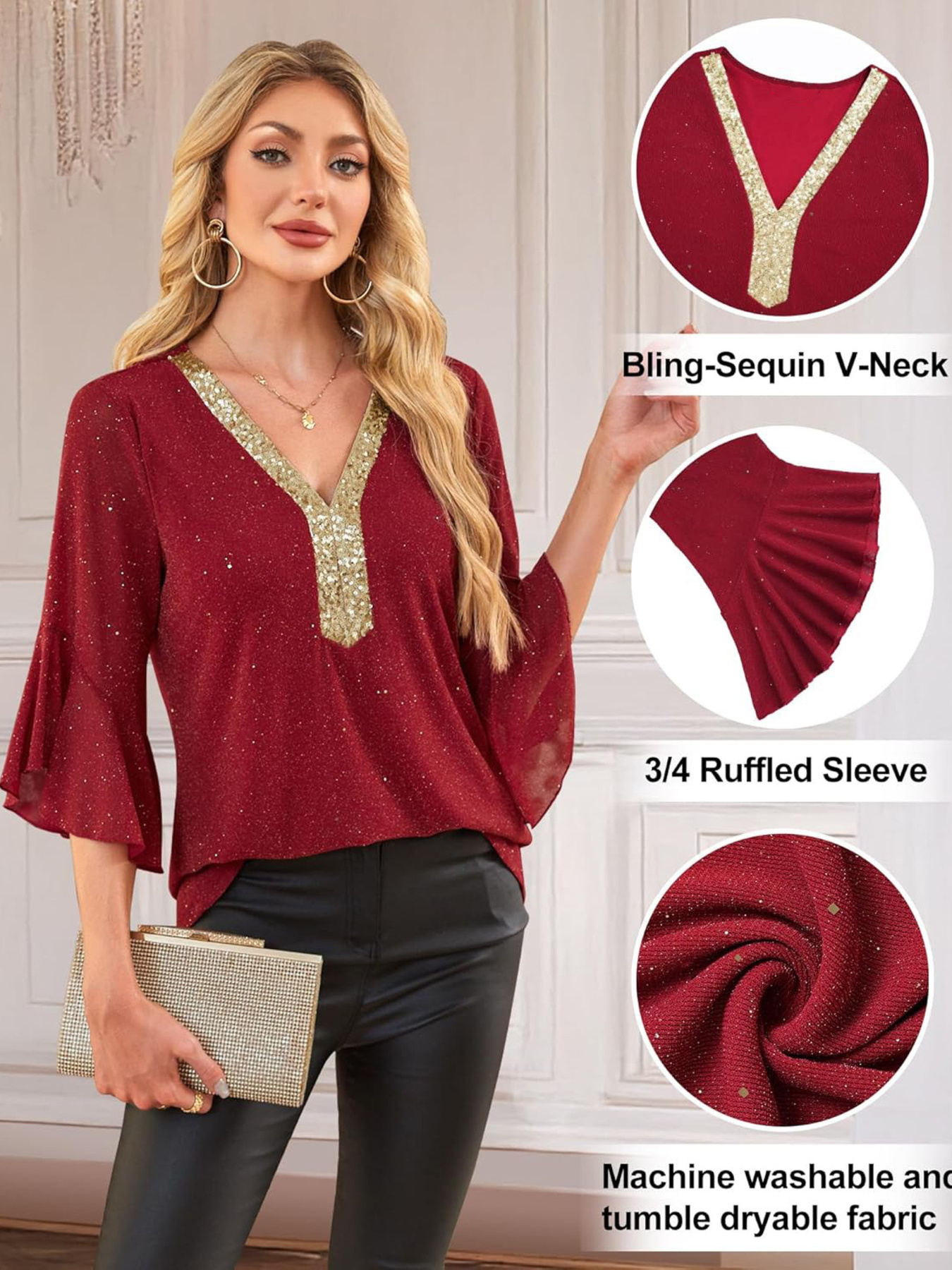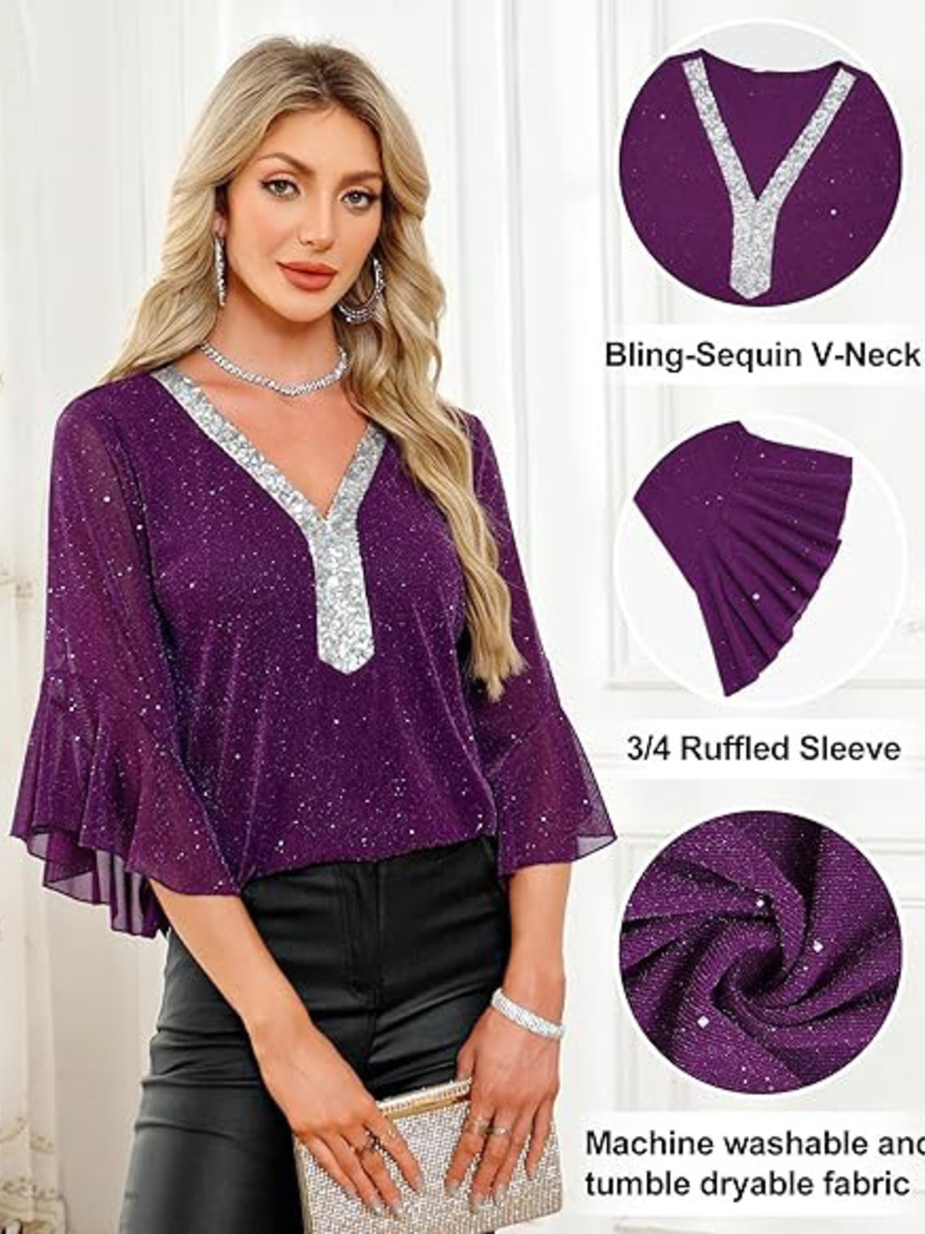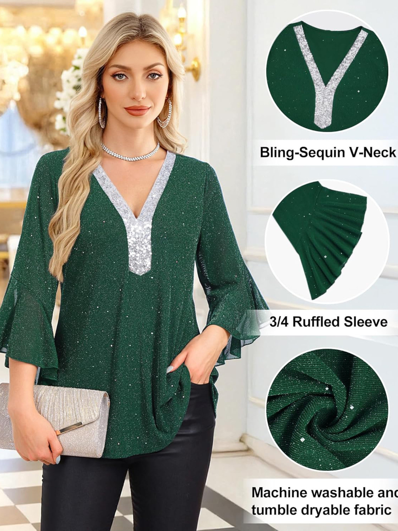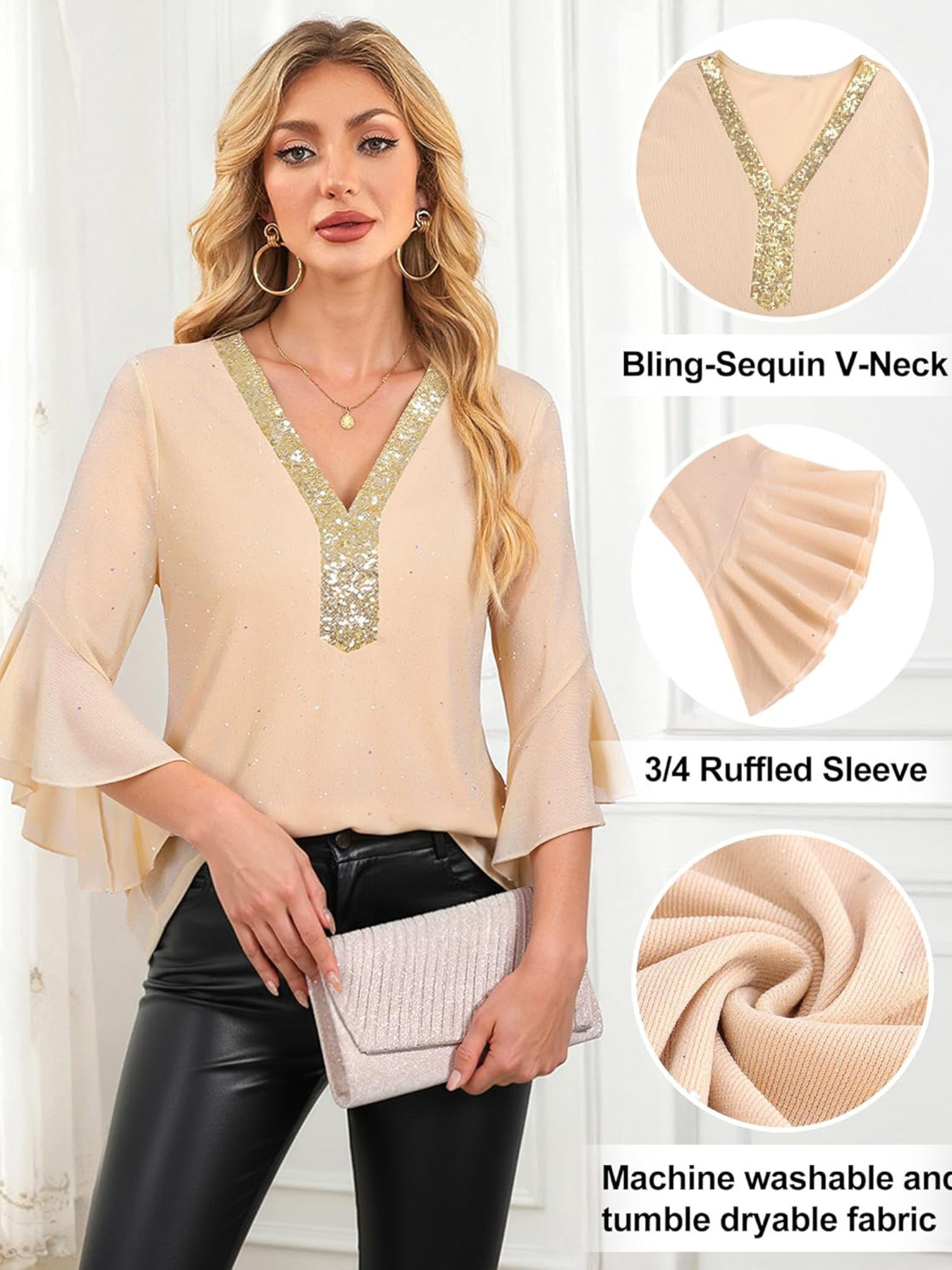 Sequin V-Neck Flounce Sleeve Blouse