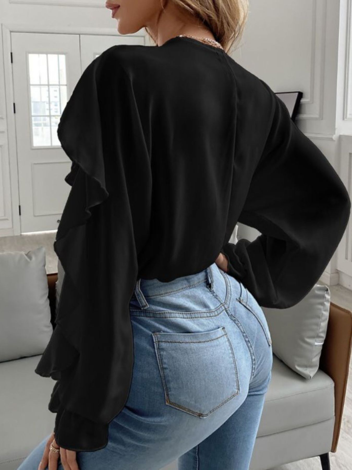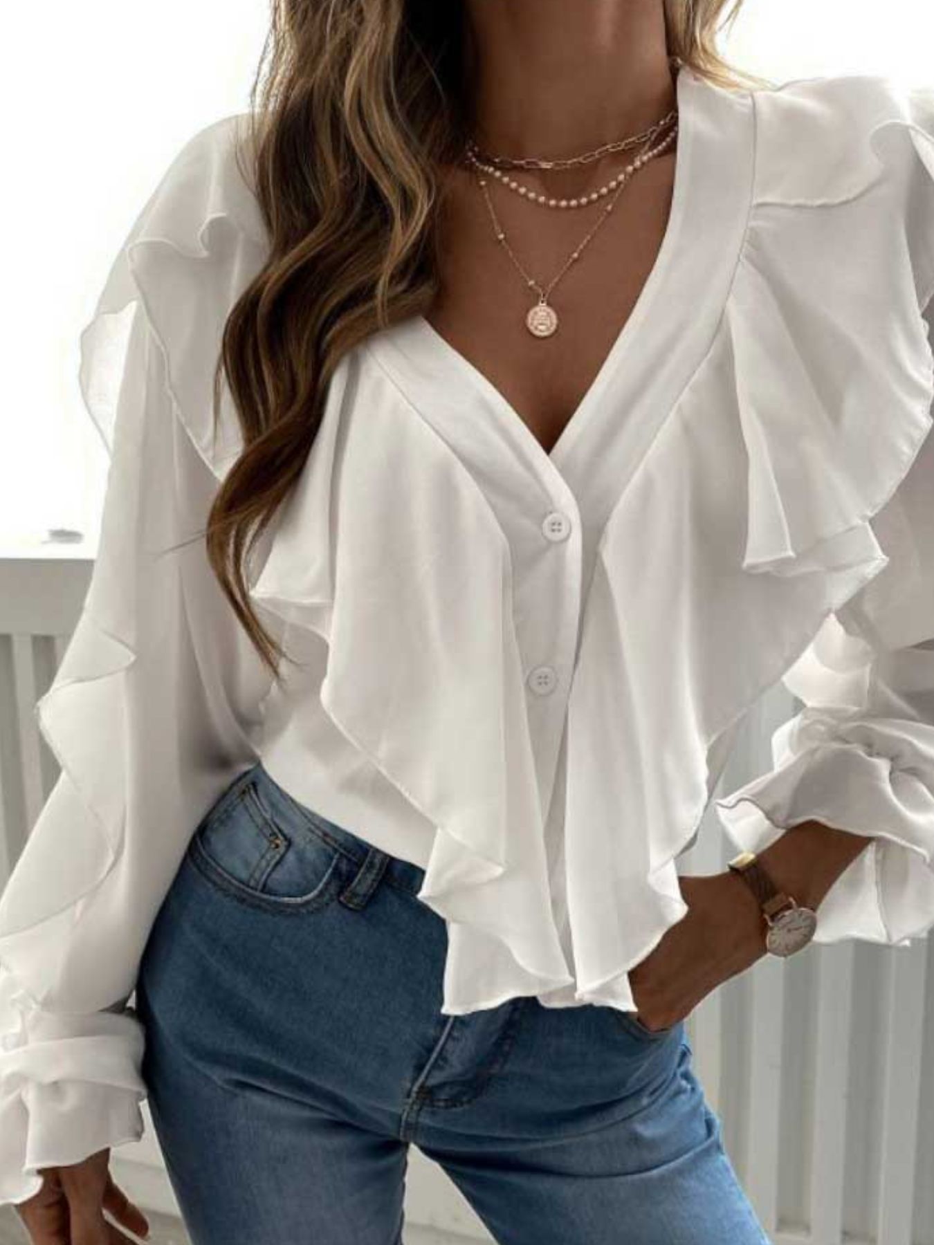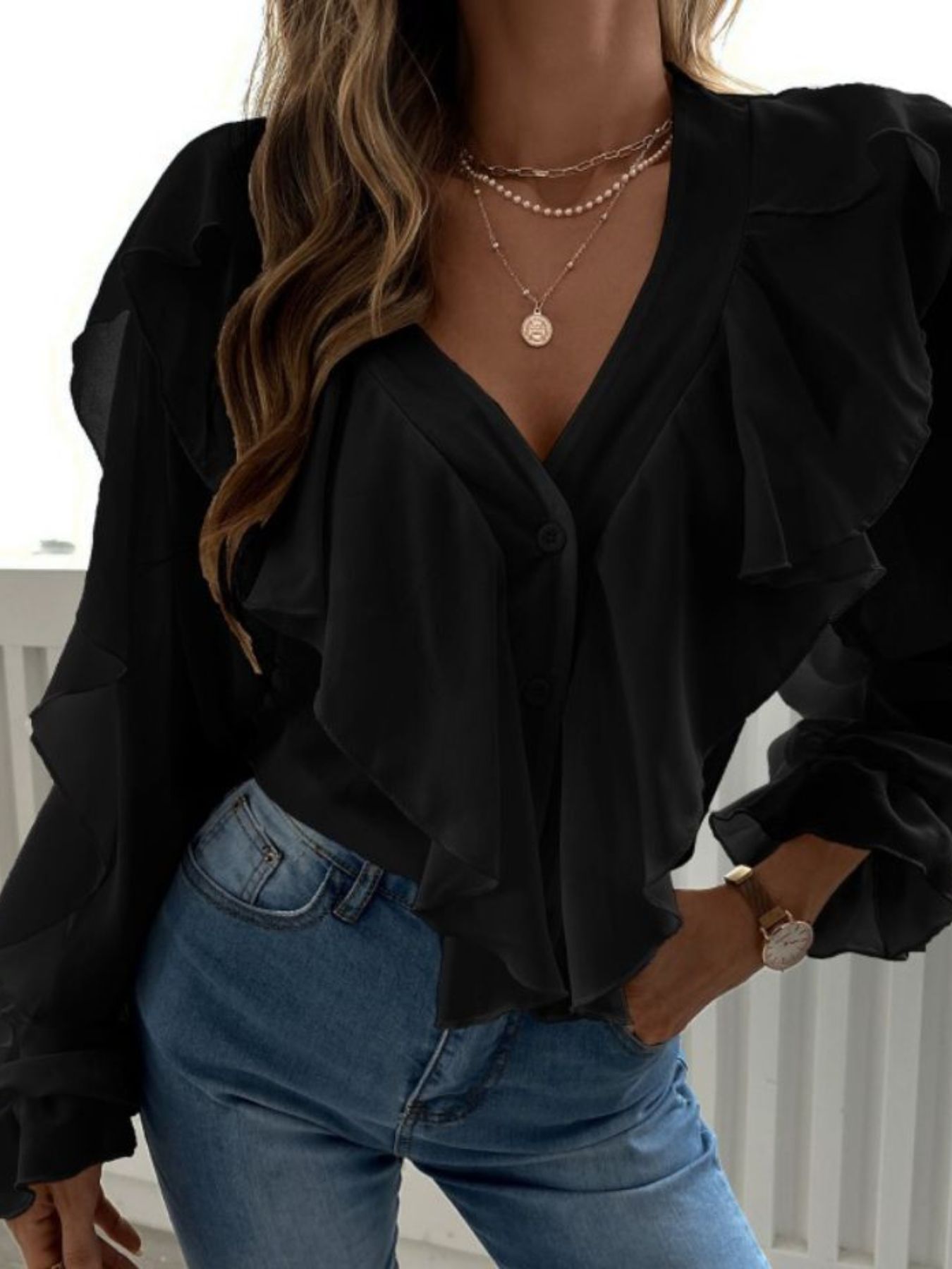 Full Size Ruffle Trim V-Neck Shirt Plus Size