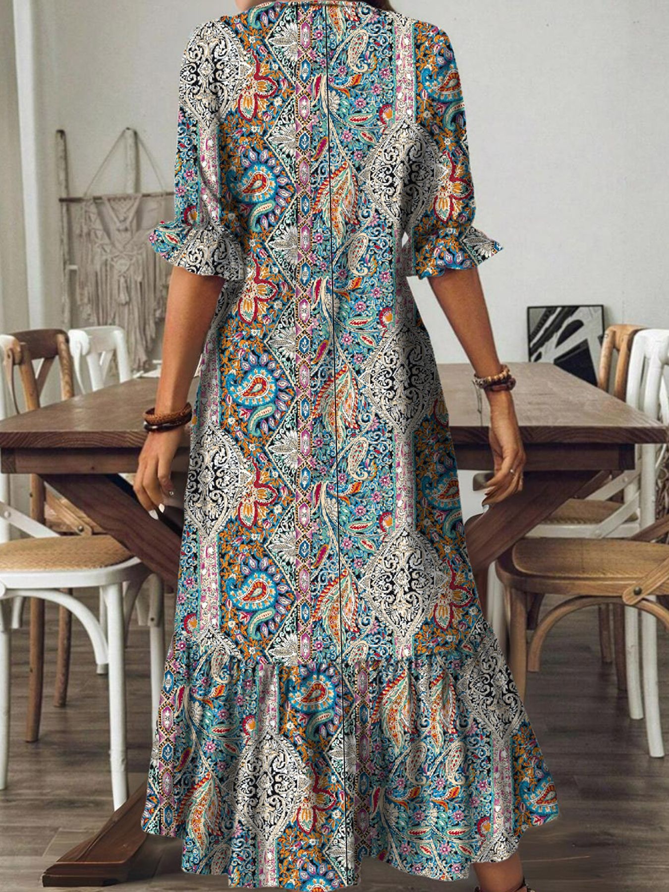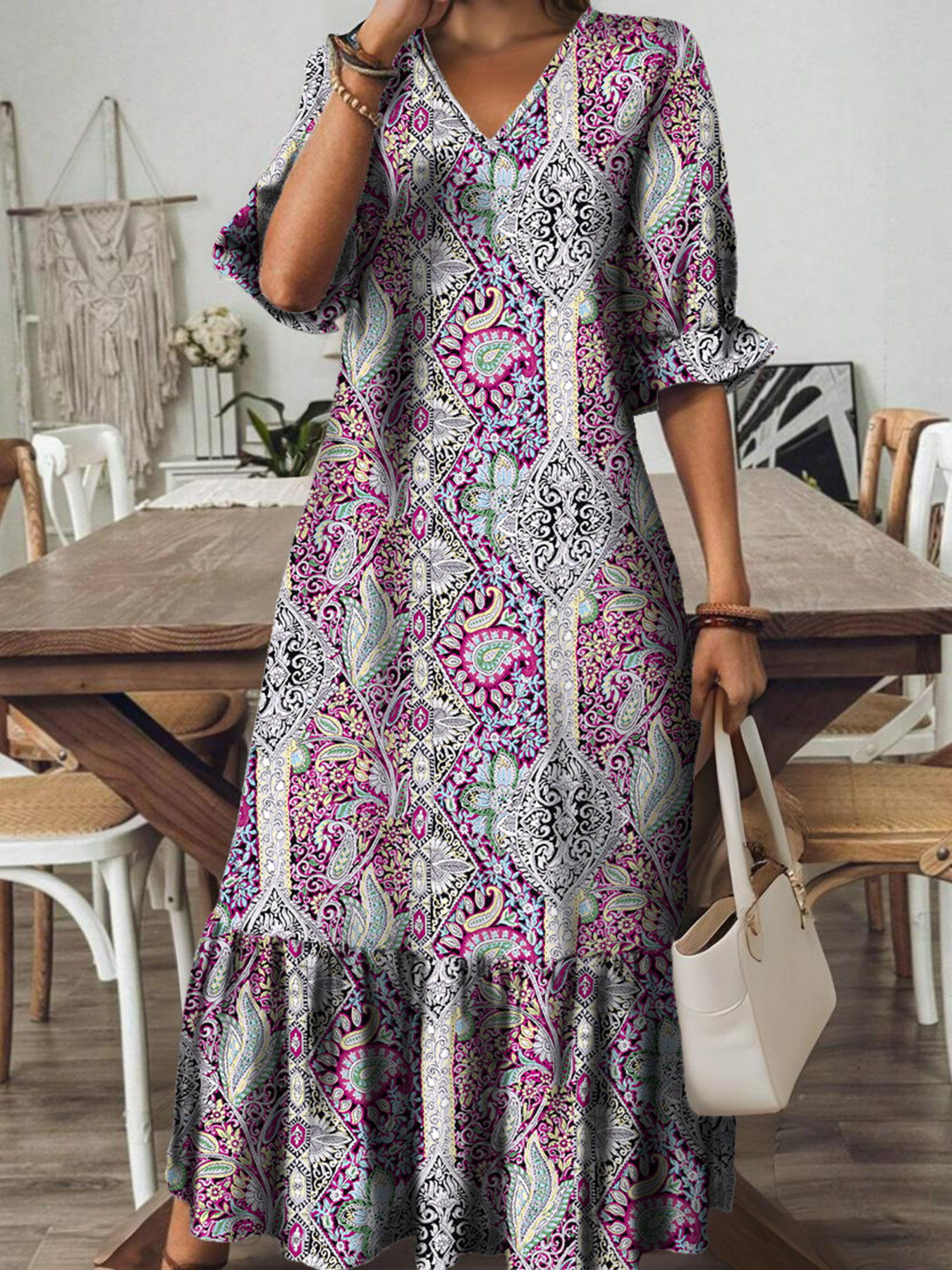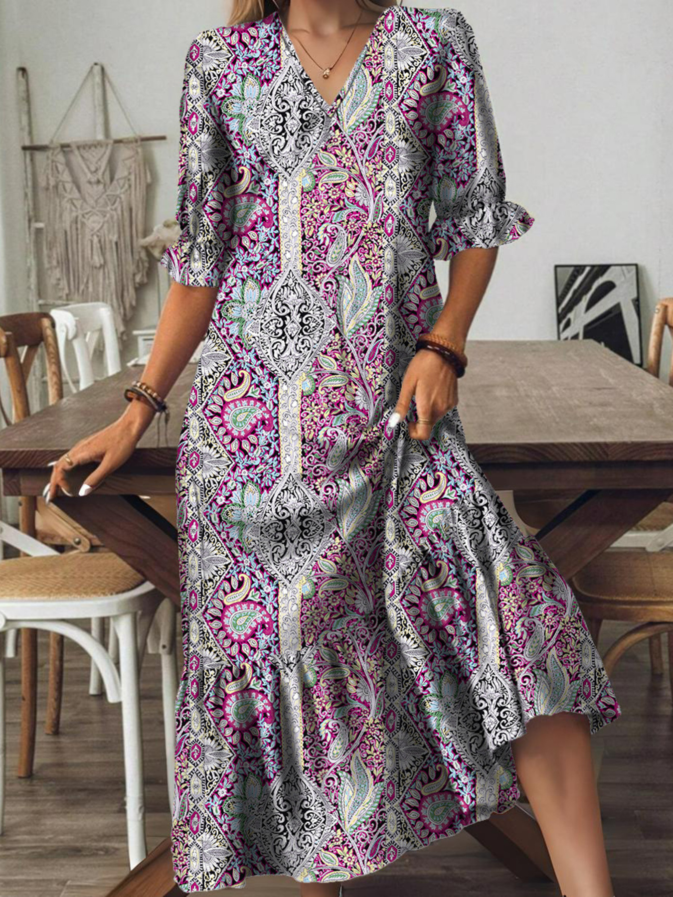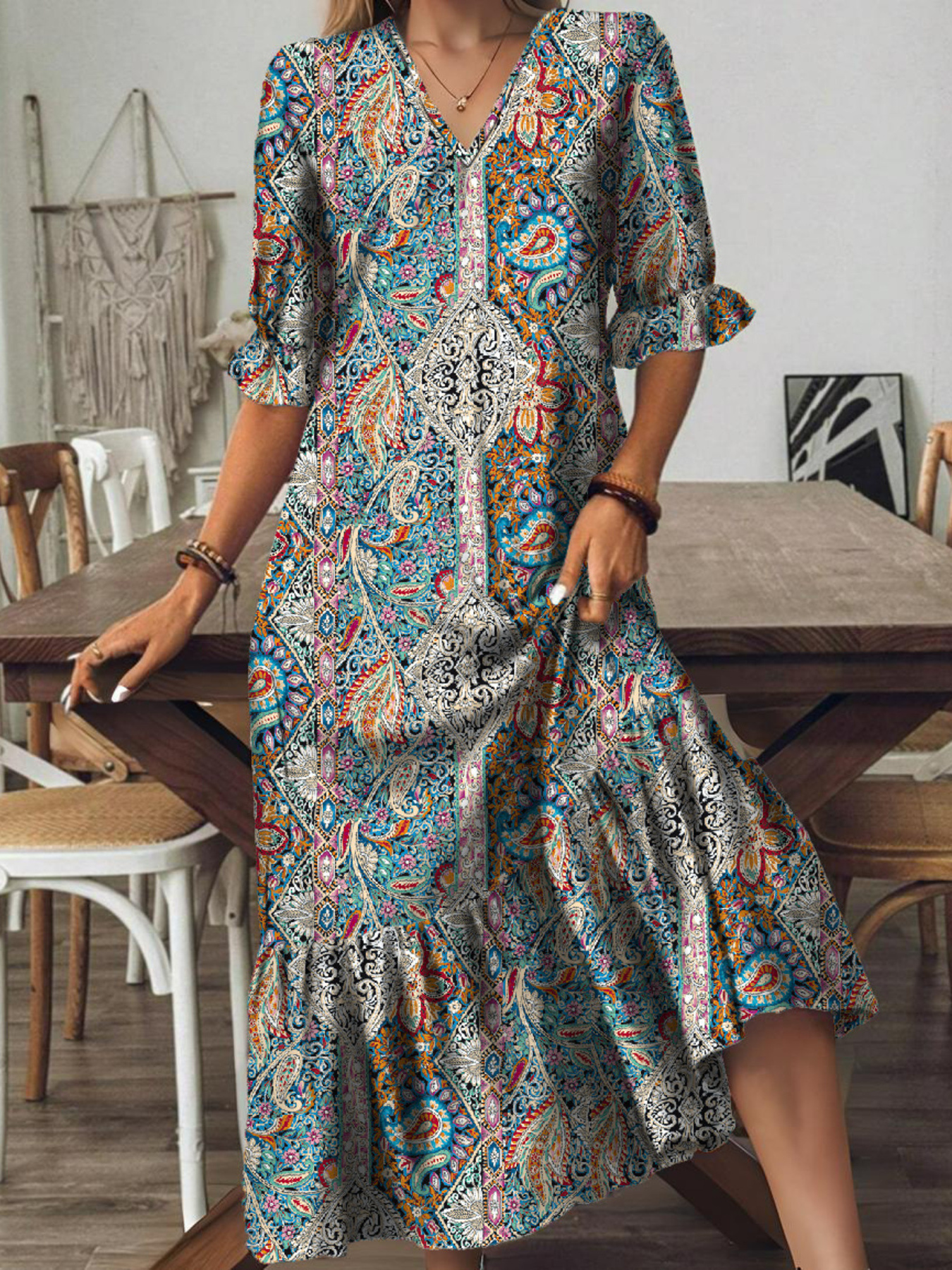 Full Size Bohemian Paisley Print V-Neck Midi Dress Plus Size