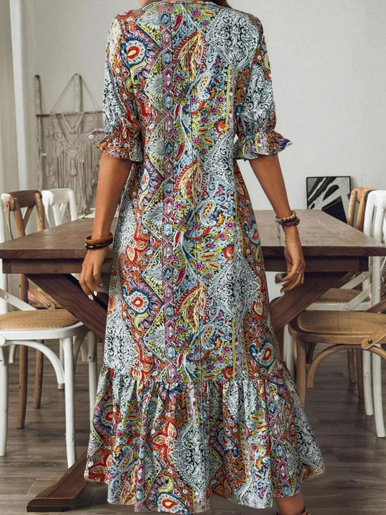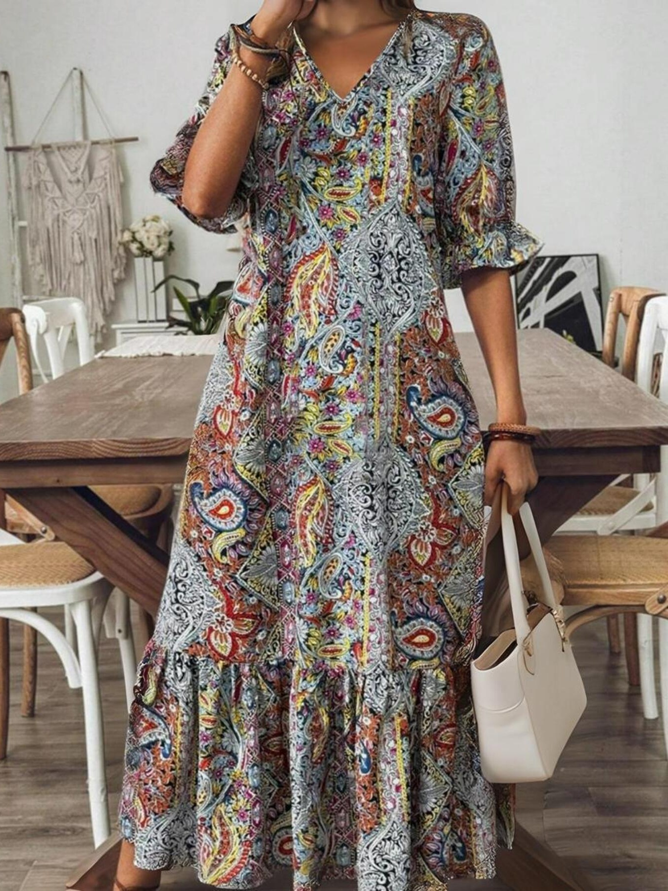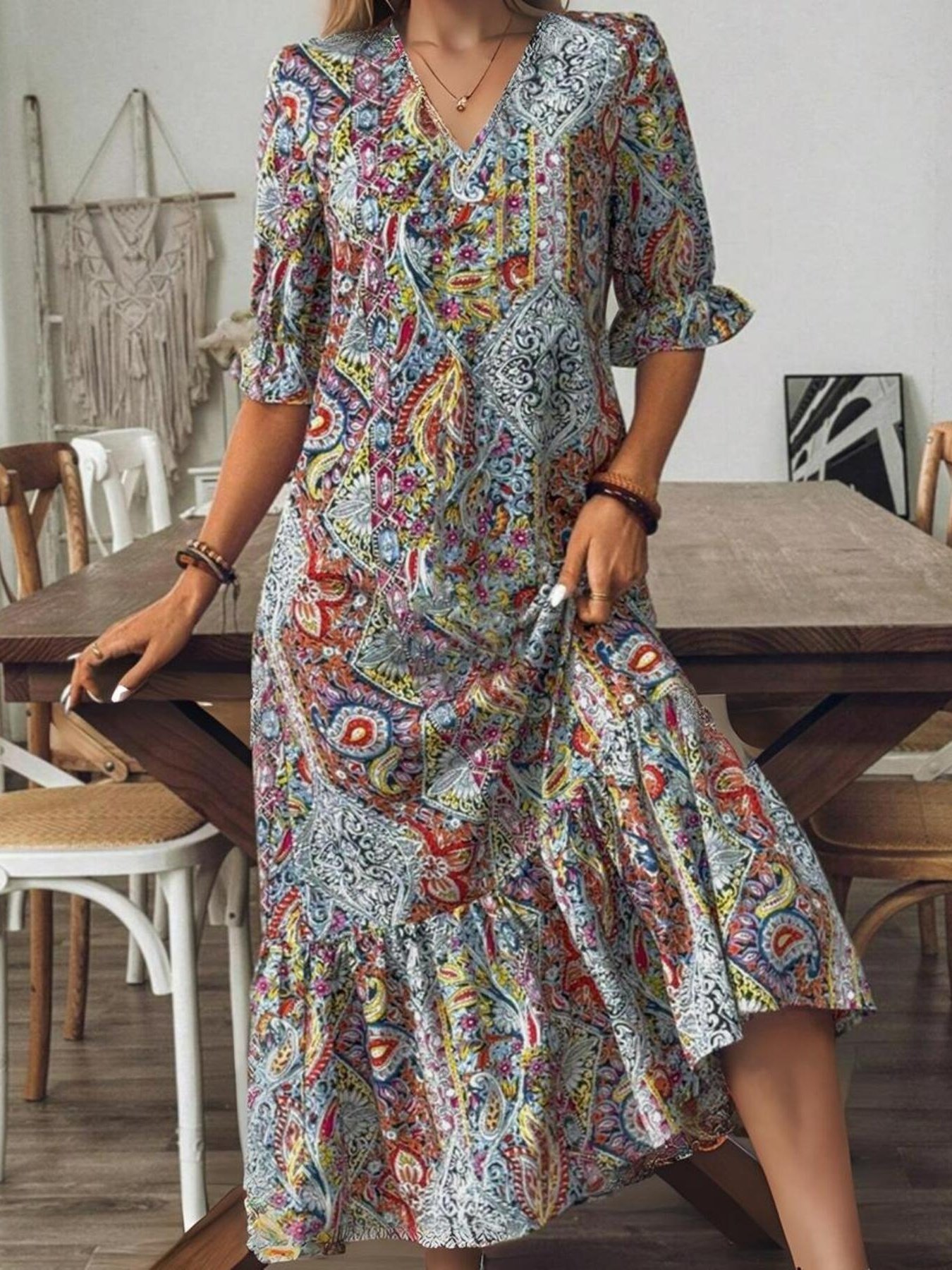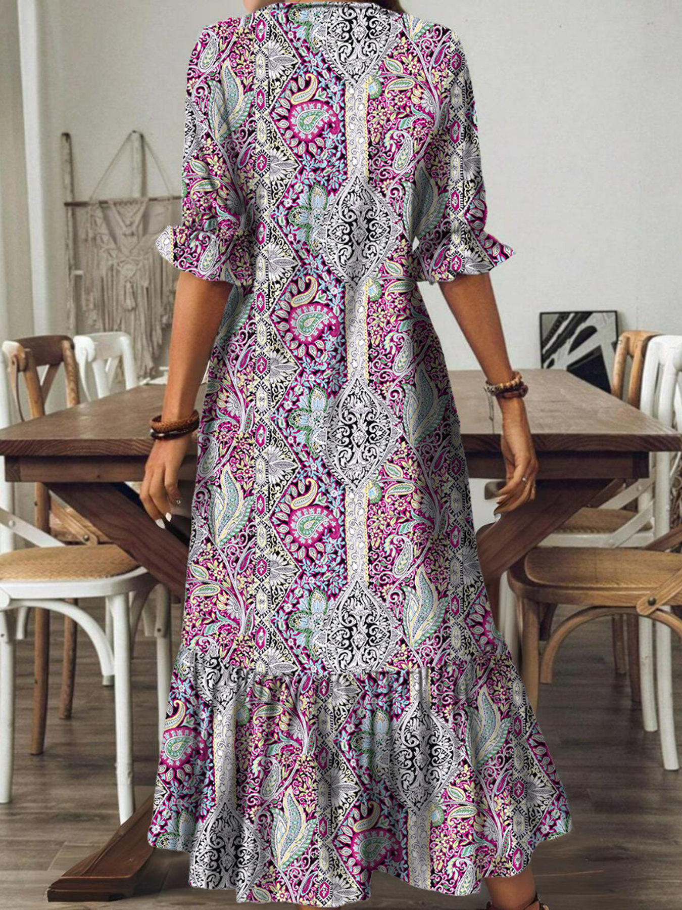 Full Size Bohemian Paisley Print V-Neck Midi Dress Plus Size