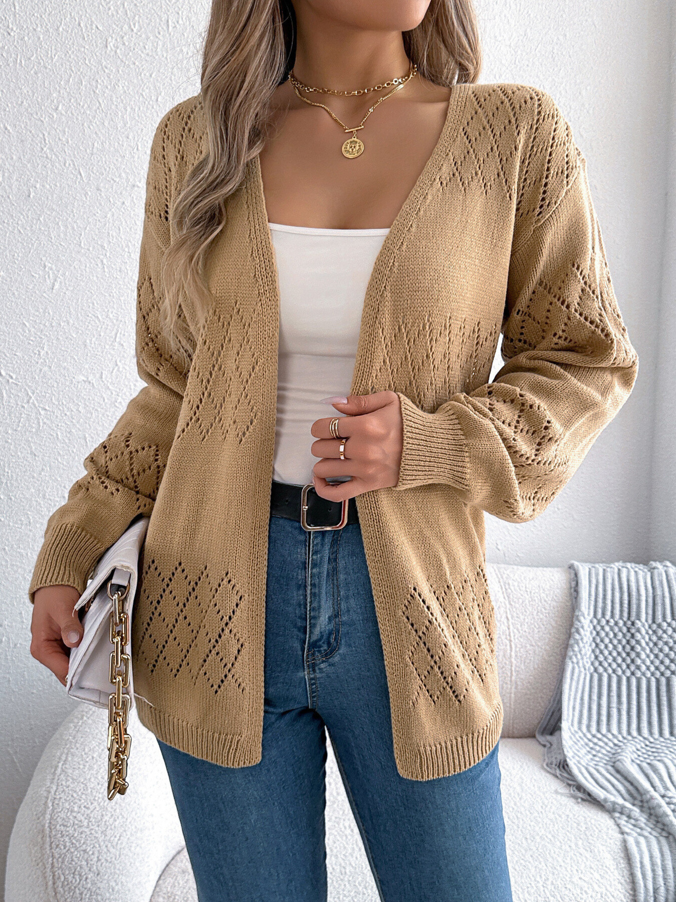 Openwork Open Front Long Sleeve Cardigan