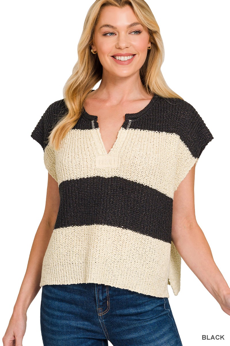 Zenana Split Neck Sleeveless Stripe Sweater