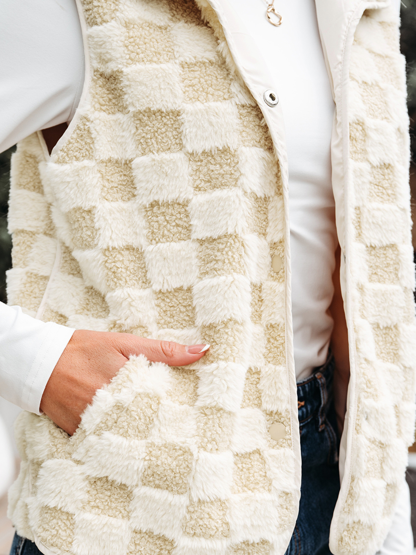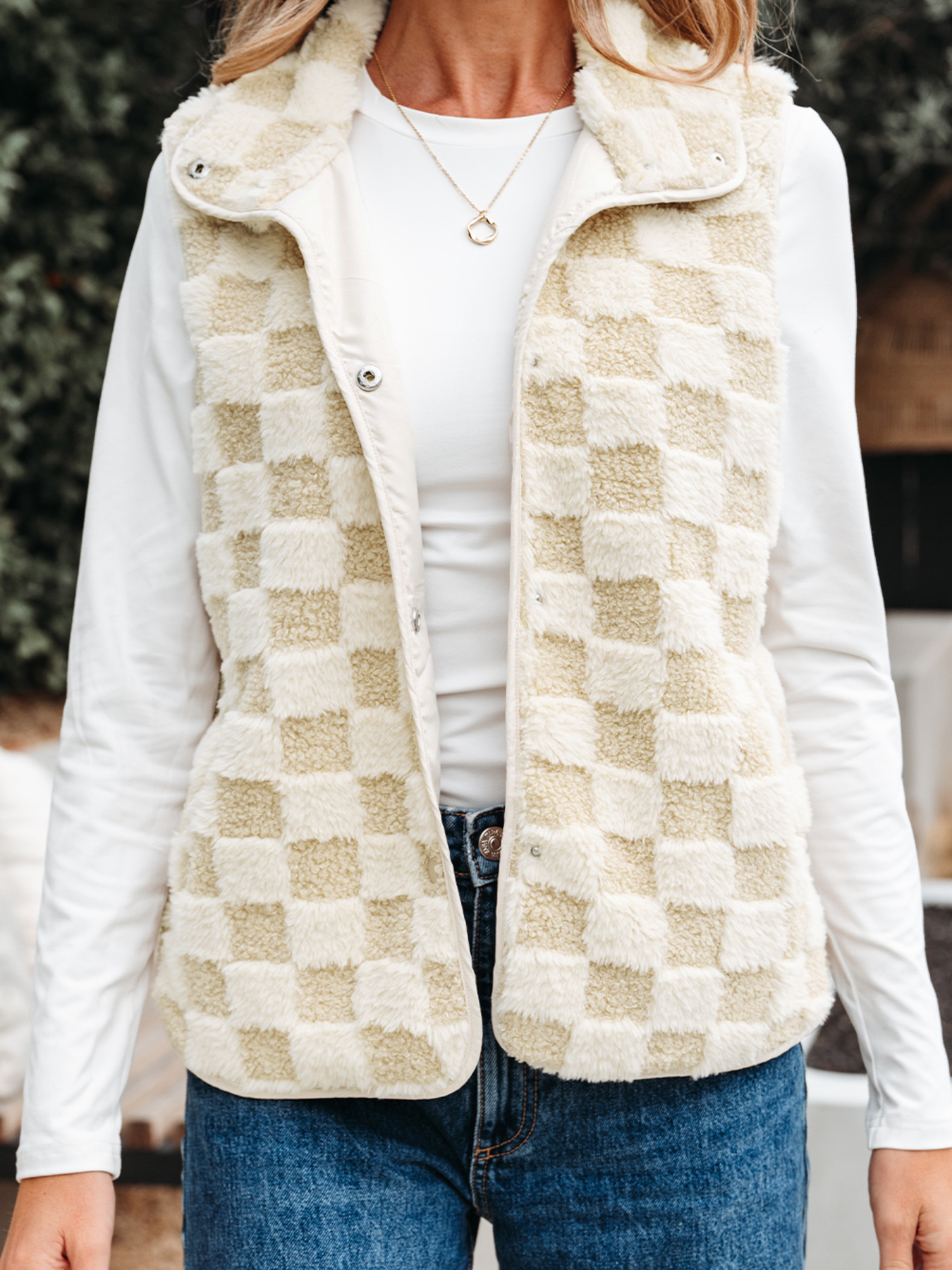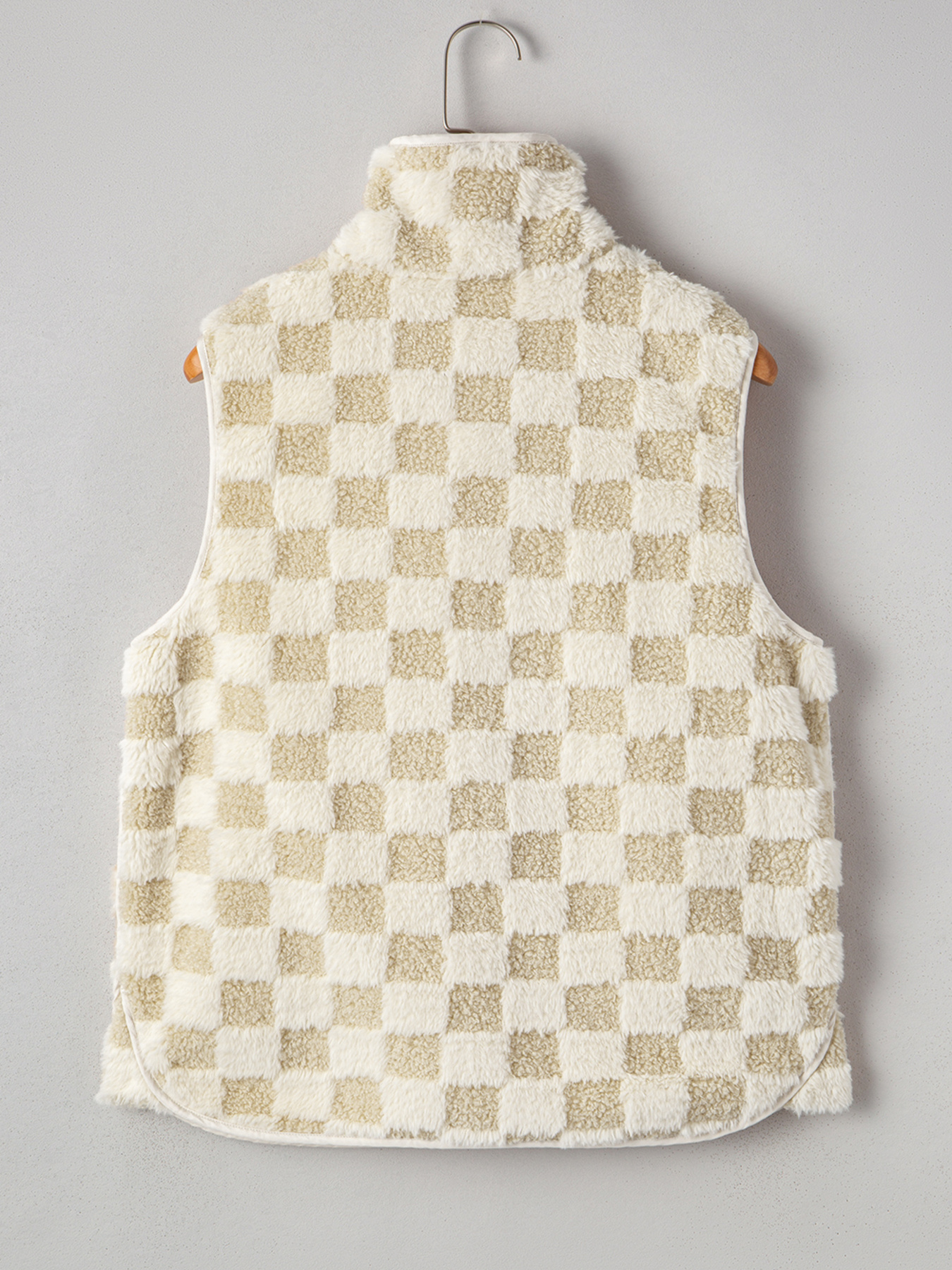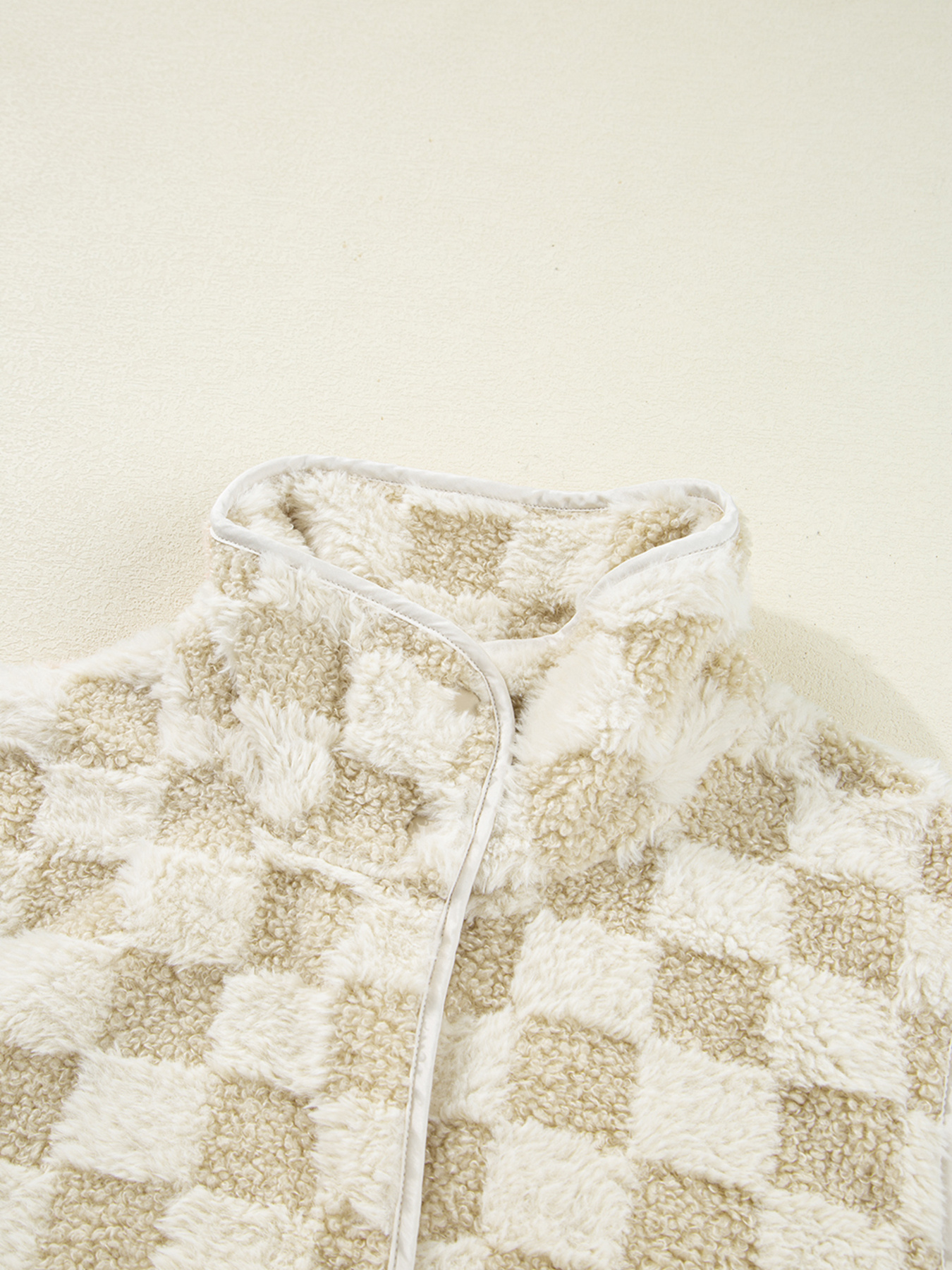 Sherpa Checkerboard Snap Button Vest Coat With Pocket