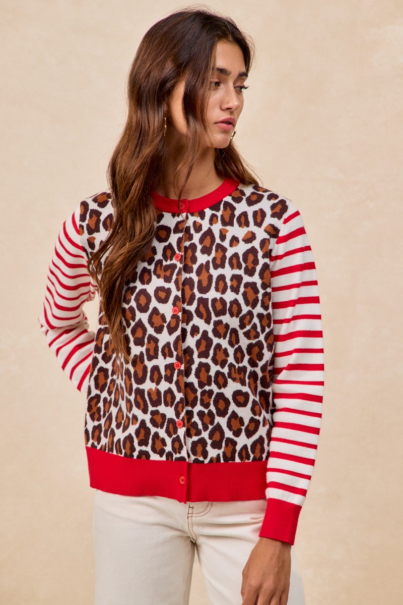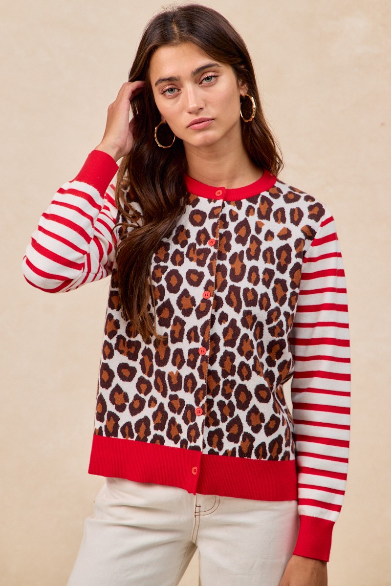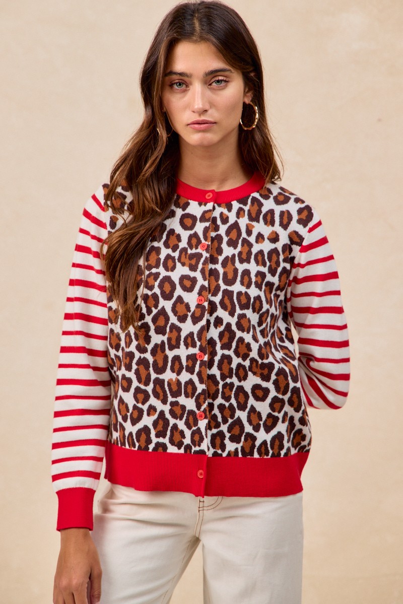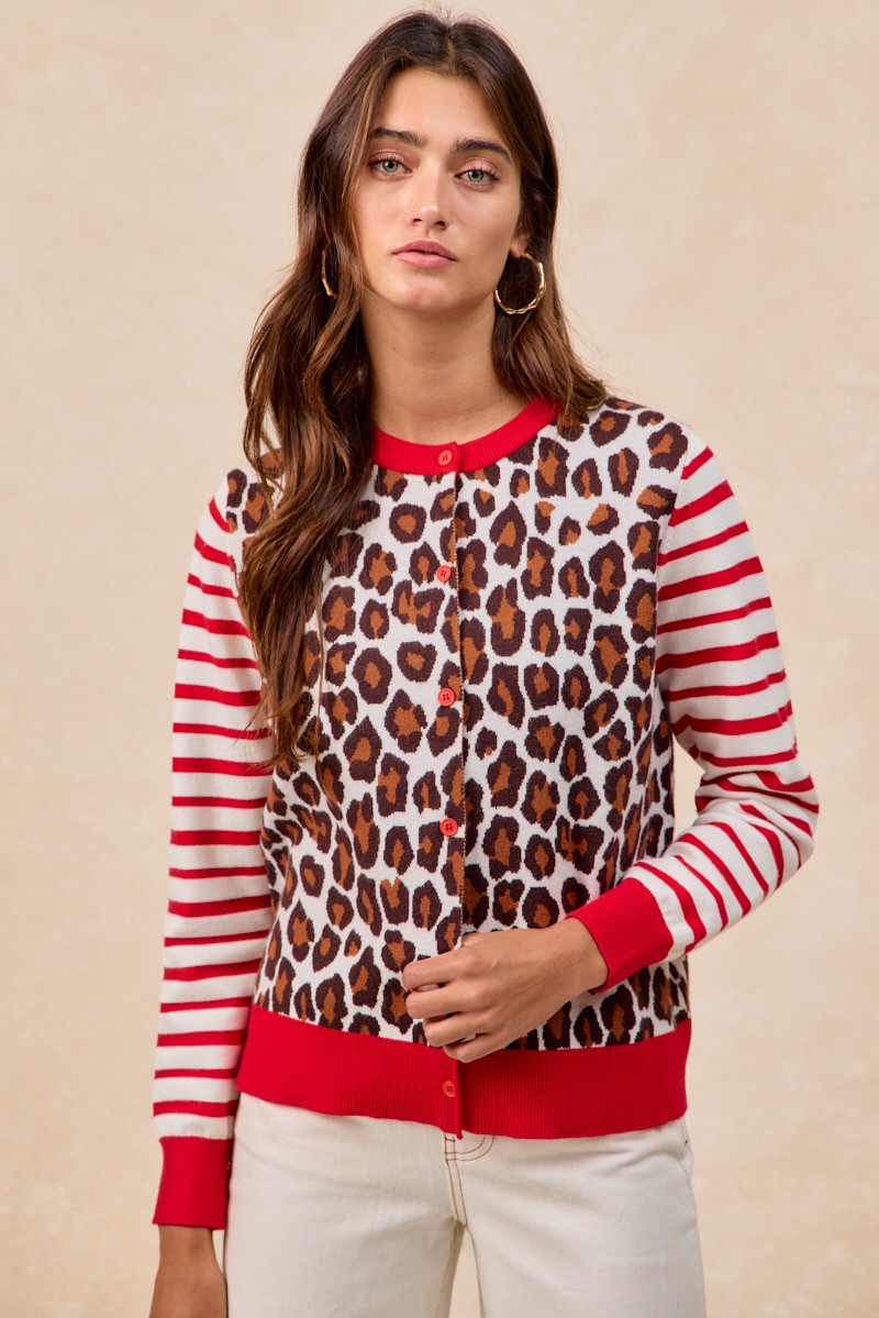 Bibi Leopard With Stripe Combo Buttoned Cardigan