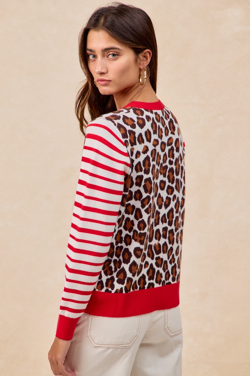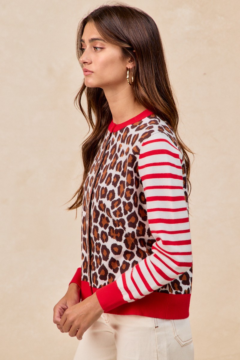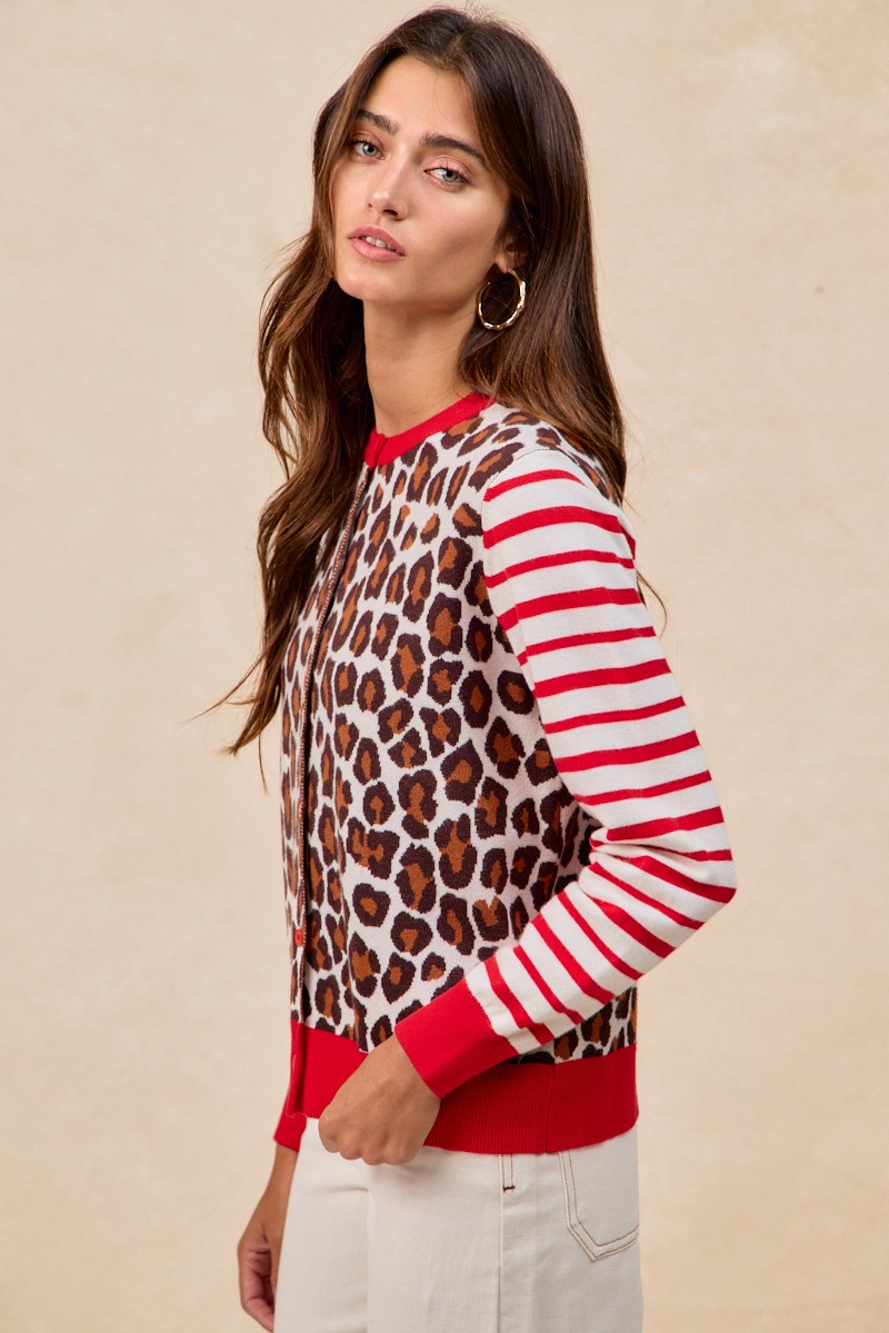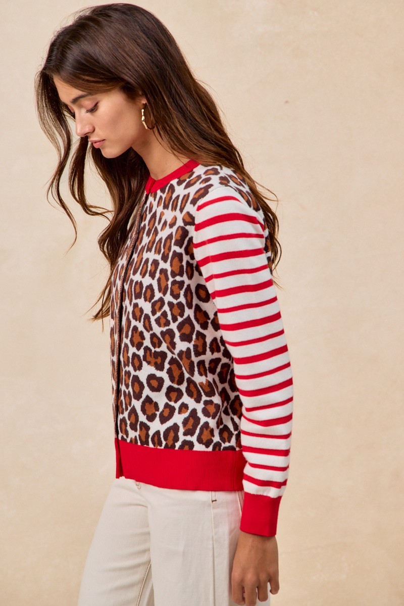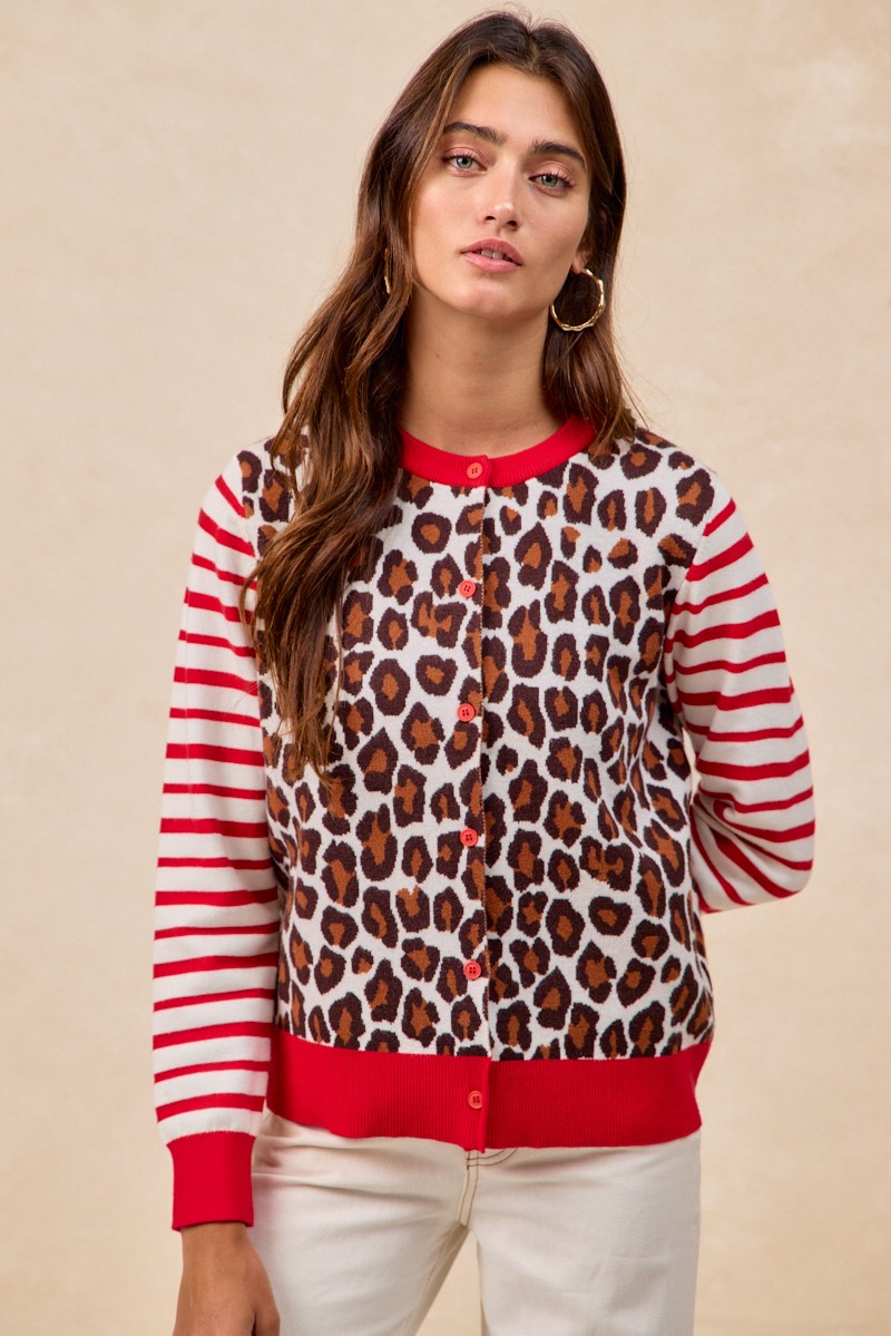 Bibi Leopard With Stripe Combo Buttoned Cardigan