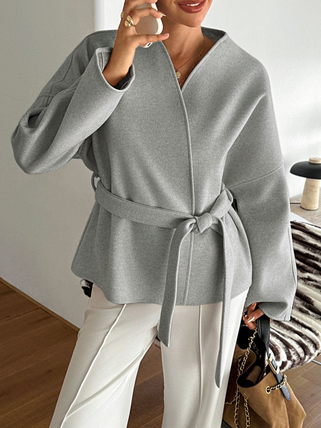 Surplice Dropped Shoulder Tie Belt Outerwear