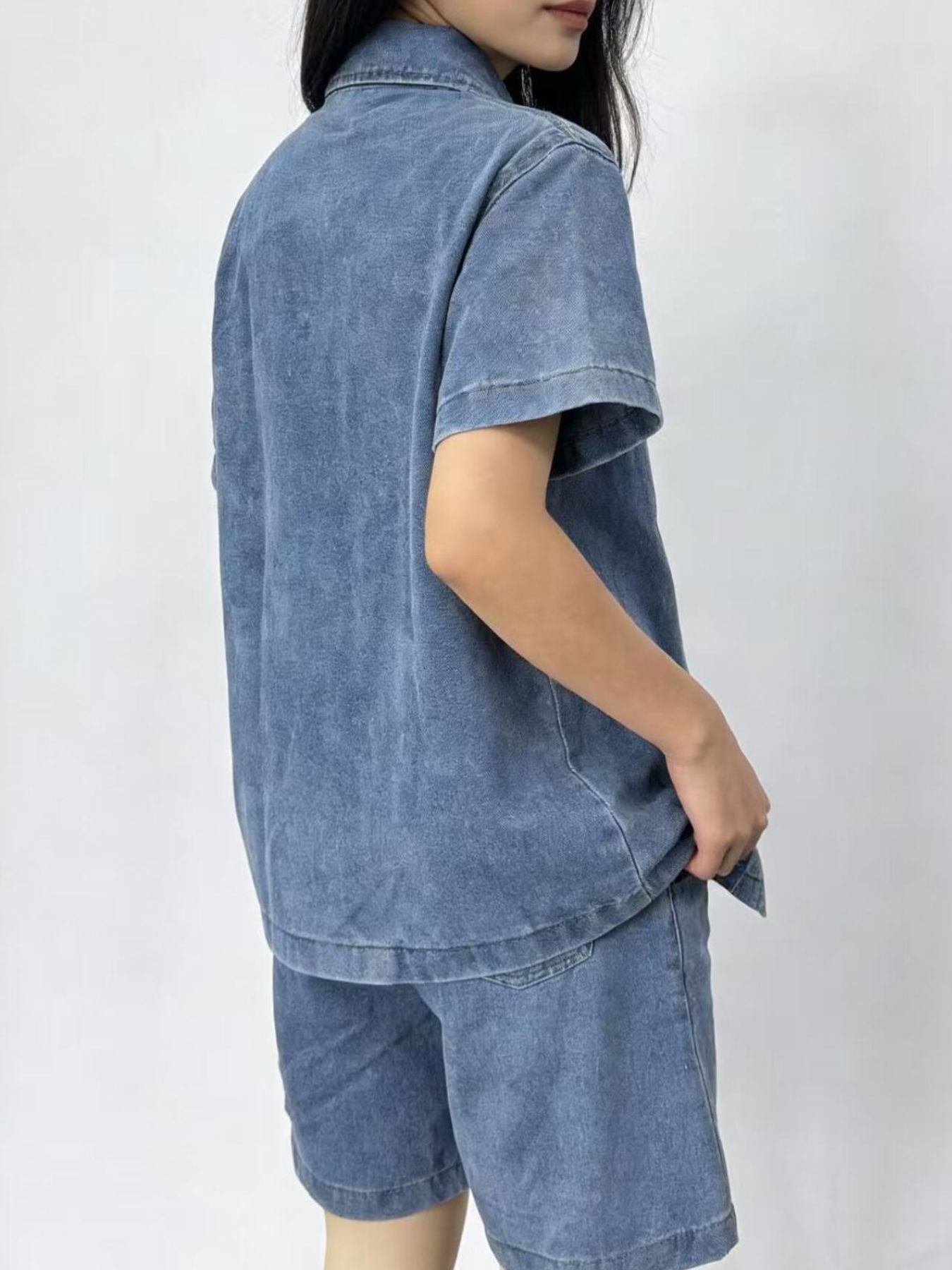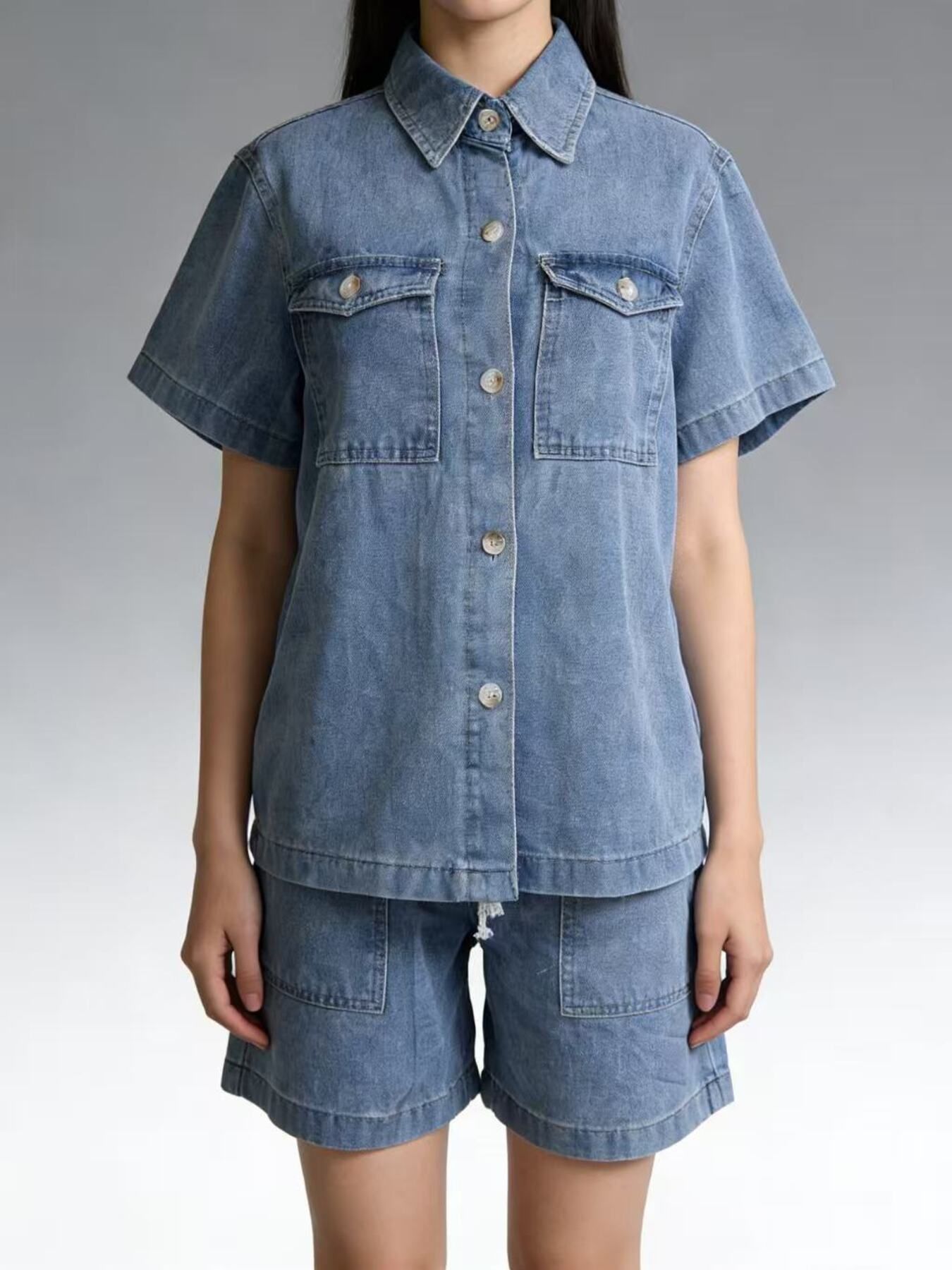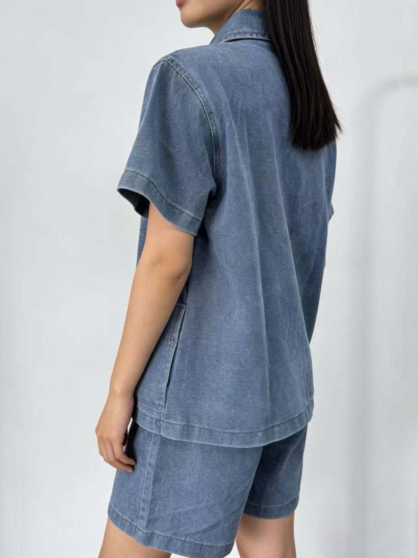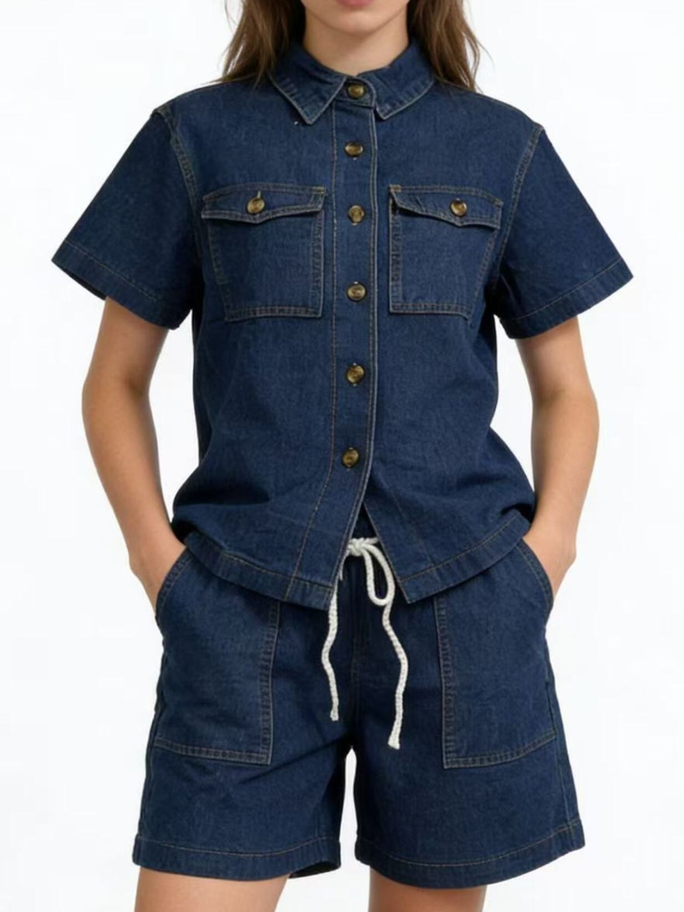 Button Up Short Sleeve Top And Shorts Denim Set