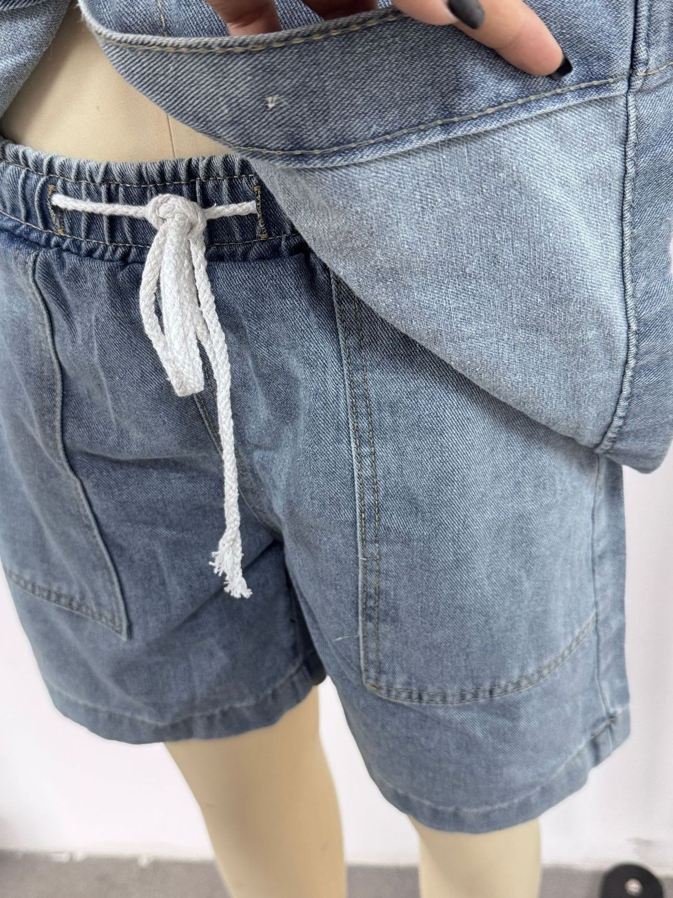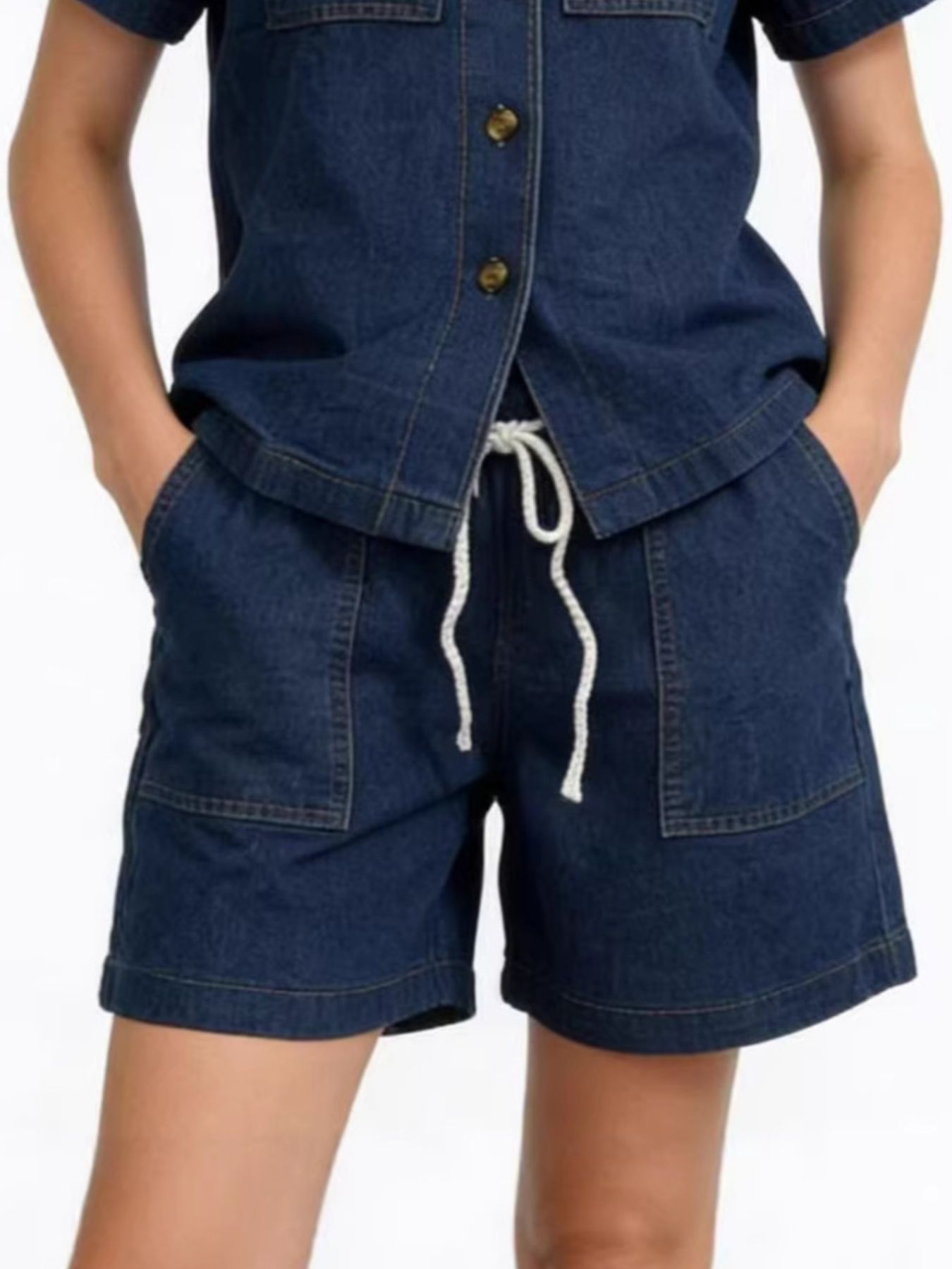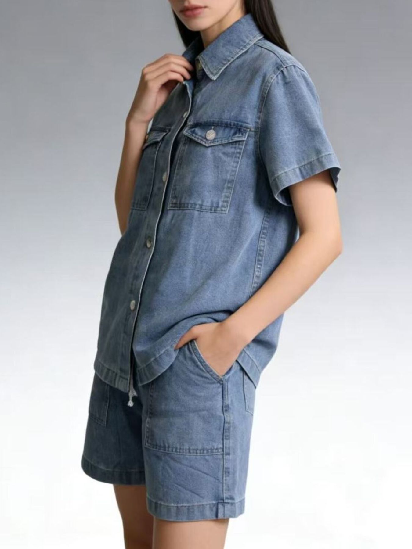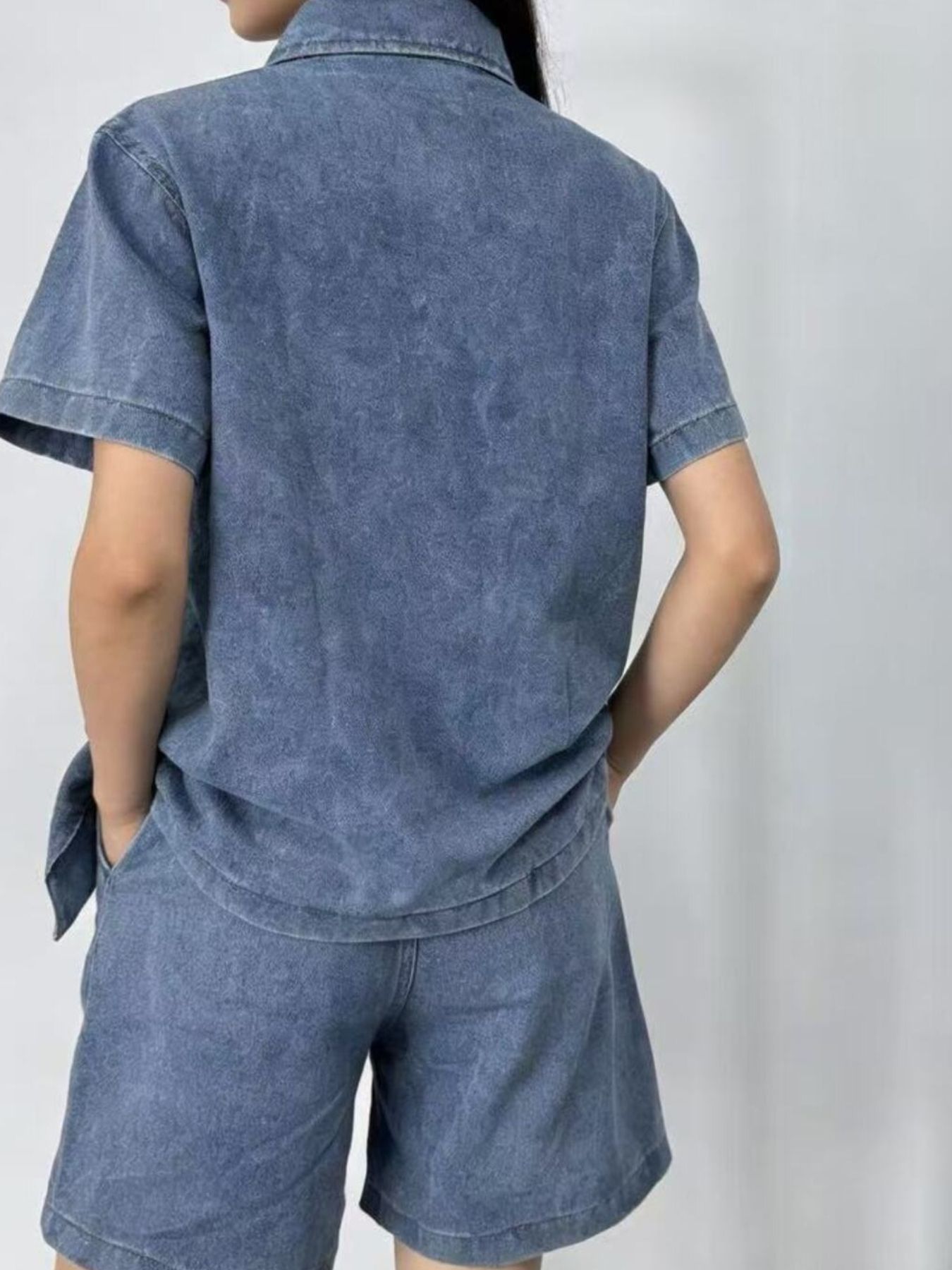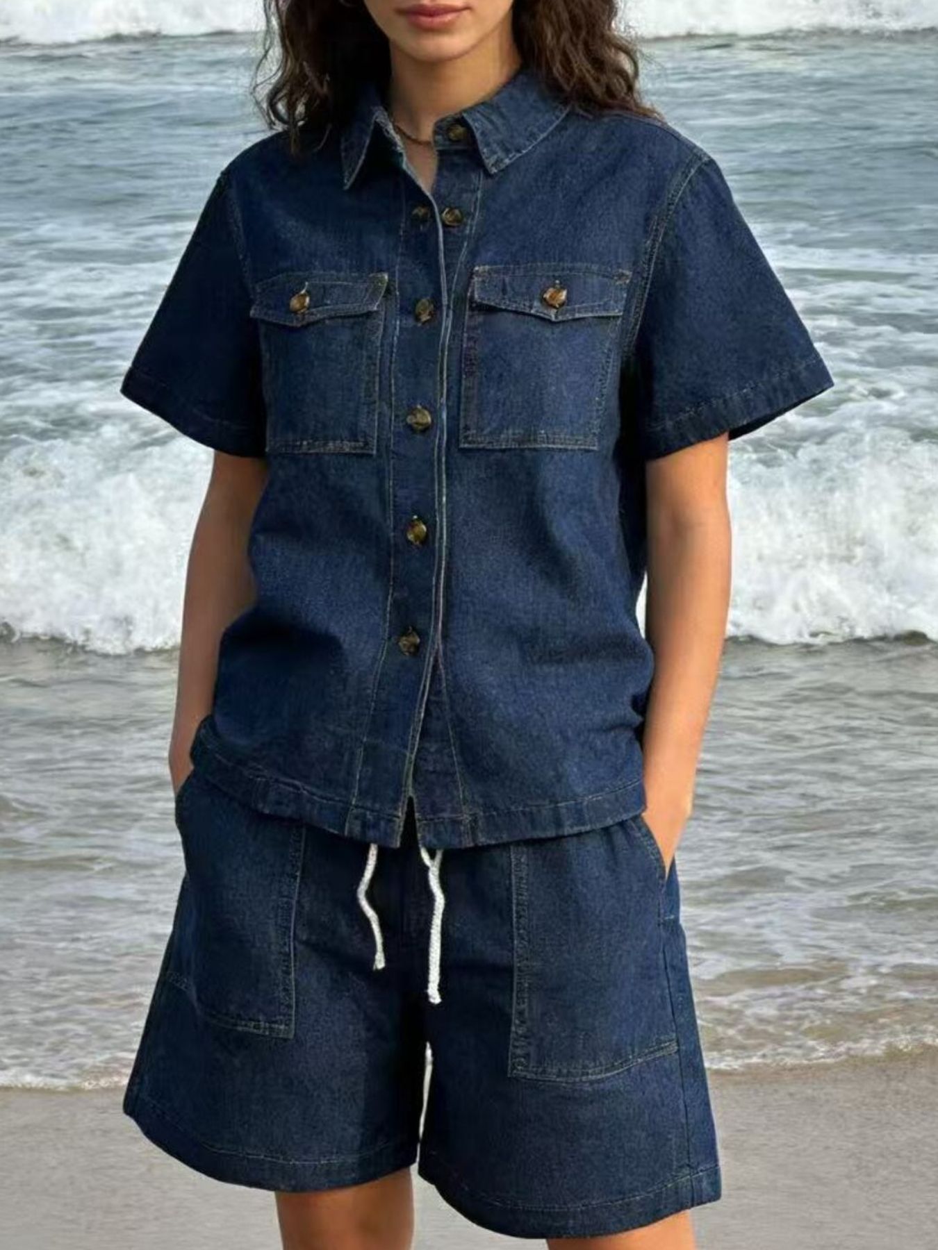 Button Up Short Sleeve Top And Shorts Denim Set