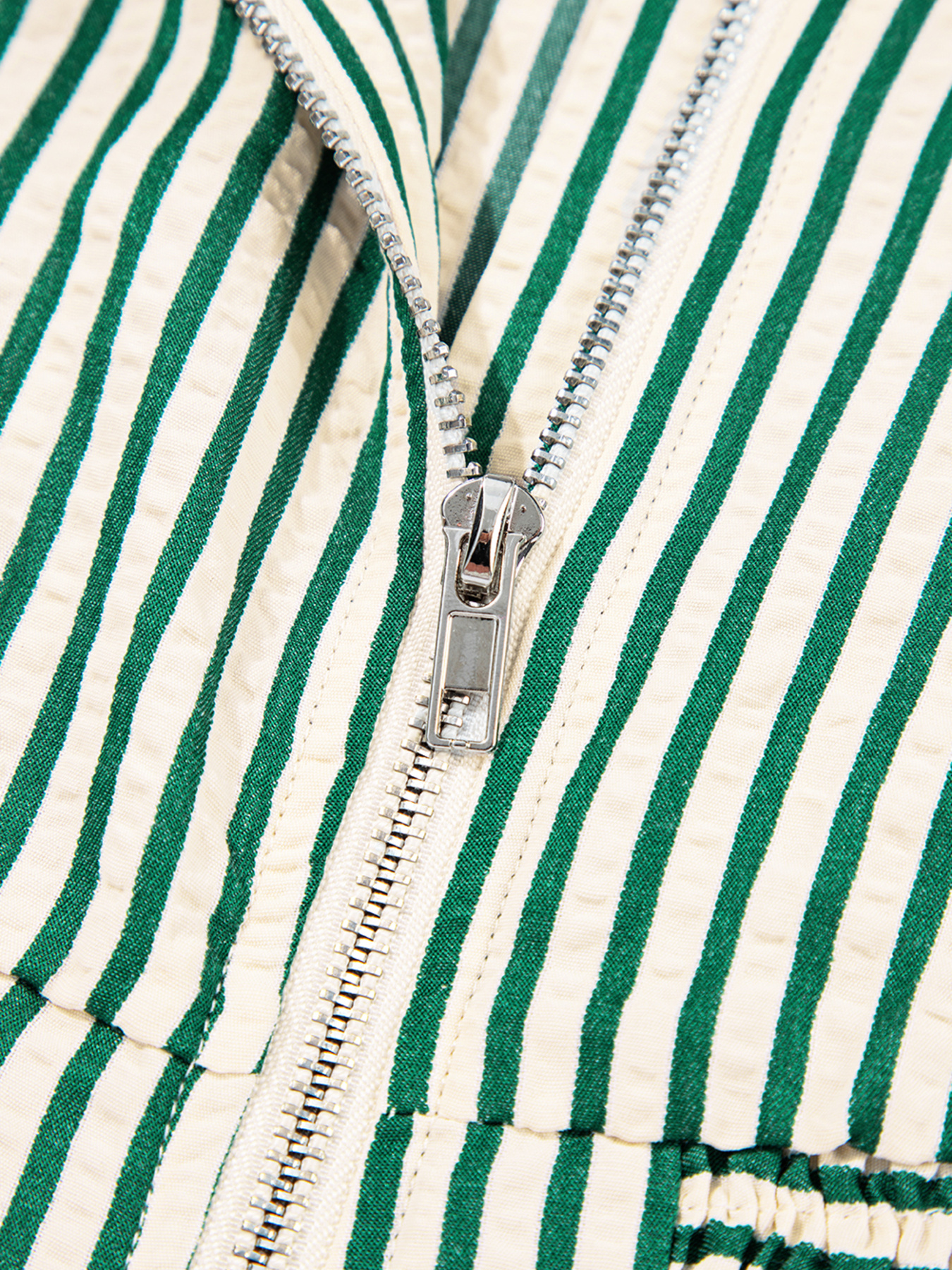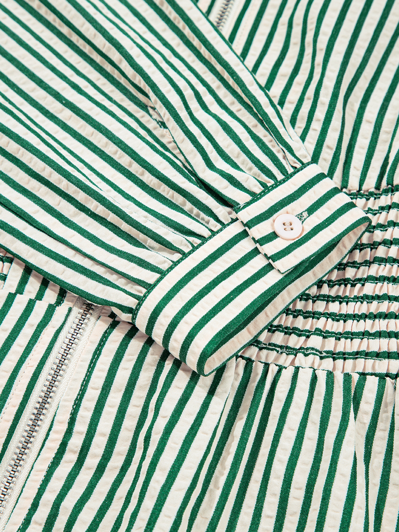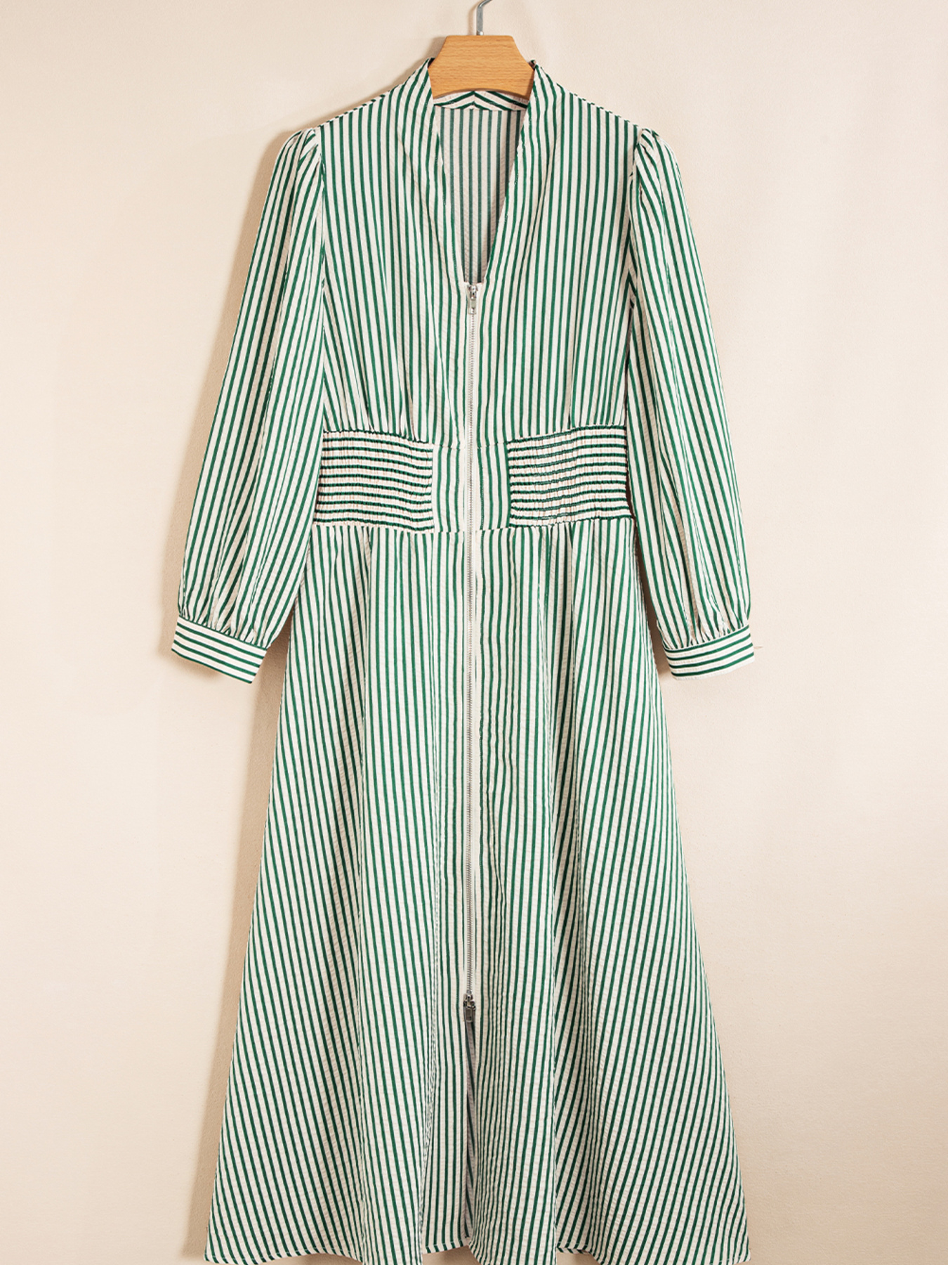 Stripe V Neck Zip Front Cinched High Waist Midi Dress
