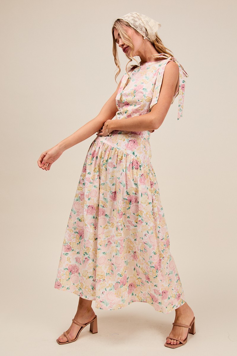 So Me Floral Printed Woven Shoulder Bow Tie Top And Skirt Set